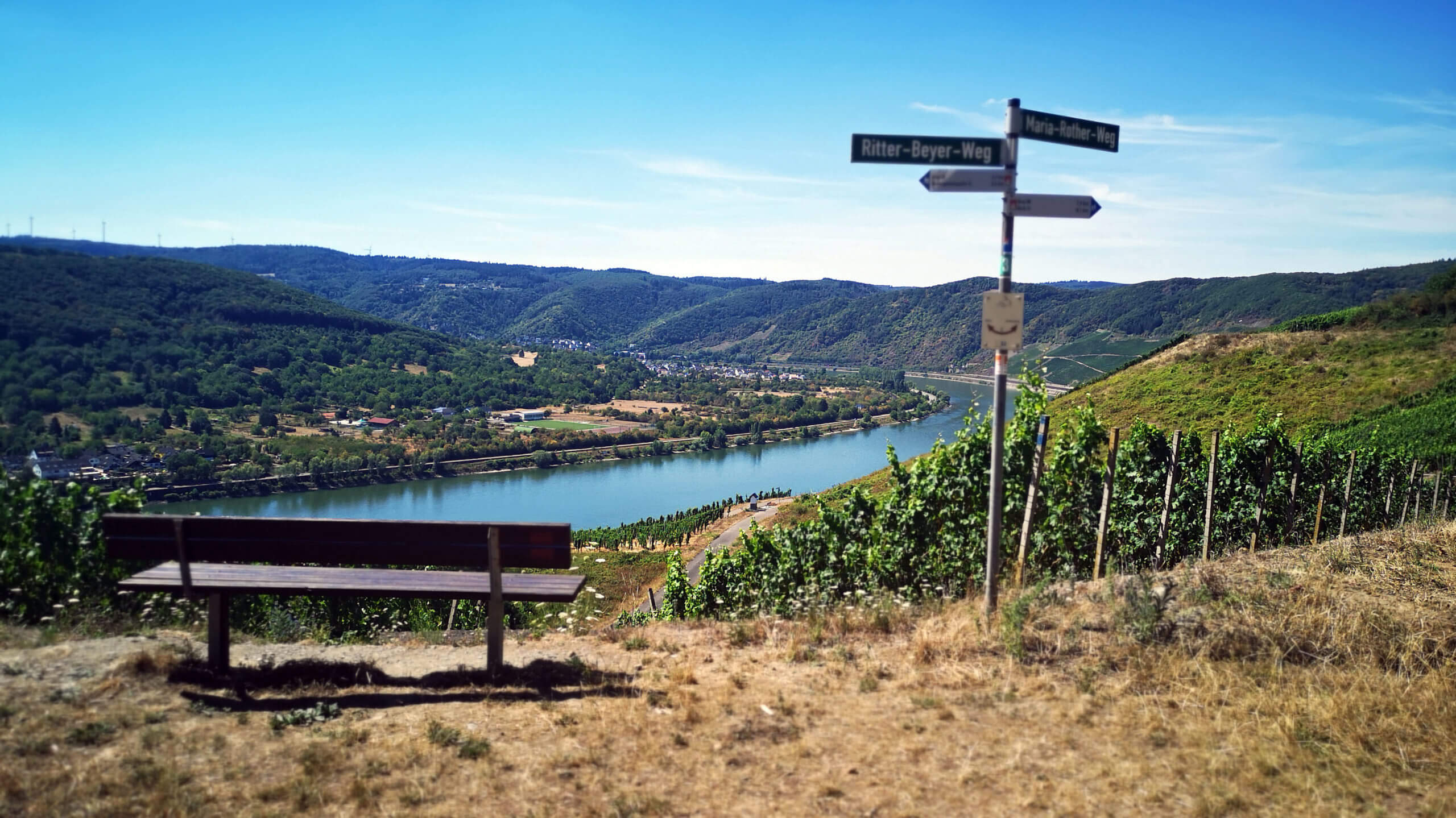 Wandern entspannt und ist ein wahrer Genuss, sagen die Hikerfreaks. Beispielsweise waren 2019 rund 7 Millionen Freizeit-Wanderer unterwegs. Schon der Einstieg in den Bopparder Hamm läuft jedoch nicht optimal. Ich bin die Einzige auf weiter Flur. Sollte die Hitze die anderen abgehalten haben? Fragen fällt also flach. Ich finde endlich Wanderinformationen und laufe los – leider in die falsche Richtung. Mein Informationsblatt versteckt sich im Rucksack, aber ich bin zu träge nachzuschauen. Also verlasse ich mich auf die Ausschilderung, nicht ahnend, dass man sich in dem 75 Hektar großen Weinberg auch verlaufen kann, wenn die Schilder in zwei unterschiedliche Richtungen zeigen. Und das tun sie. Also laufe ich mehr oder weniger nach Gefühl.
