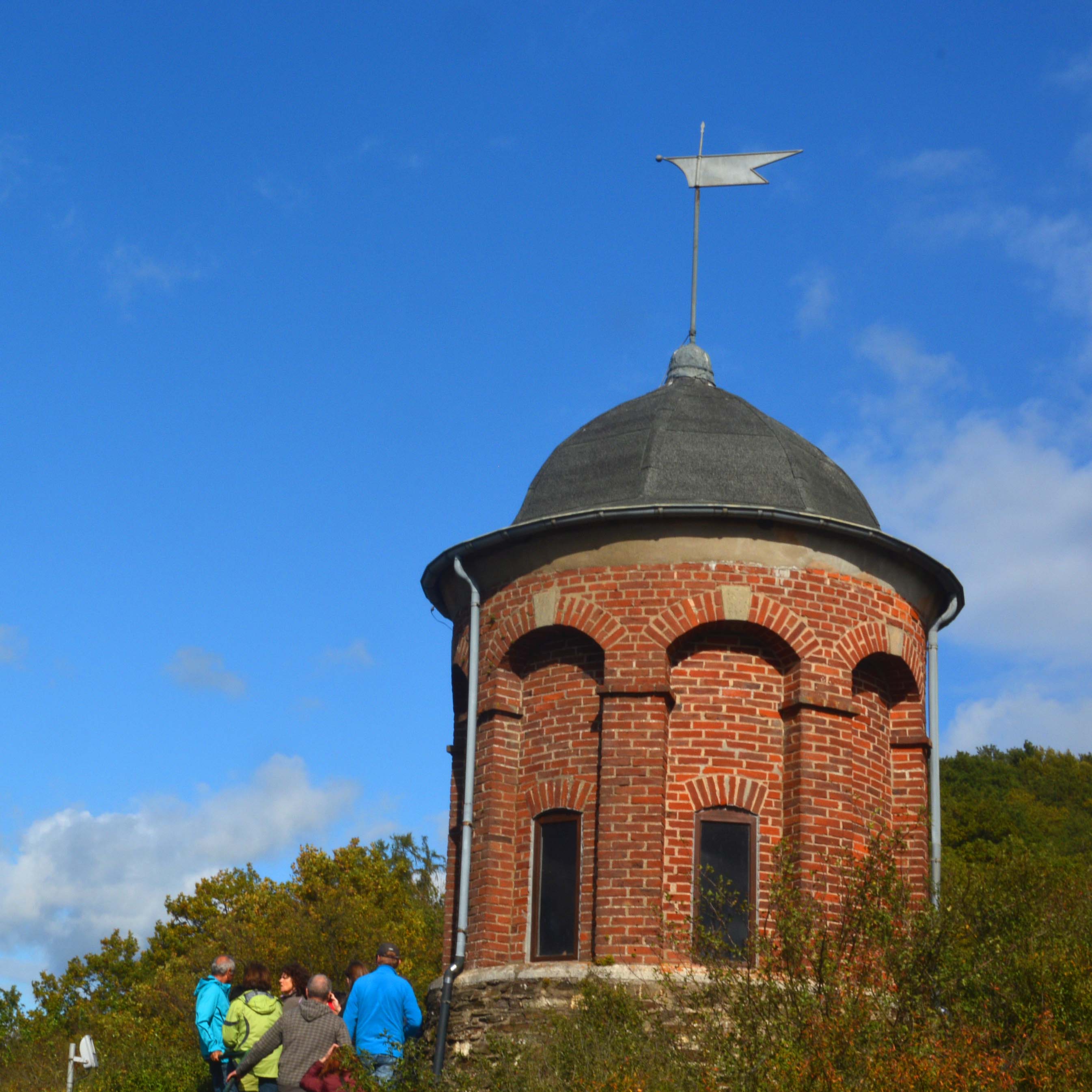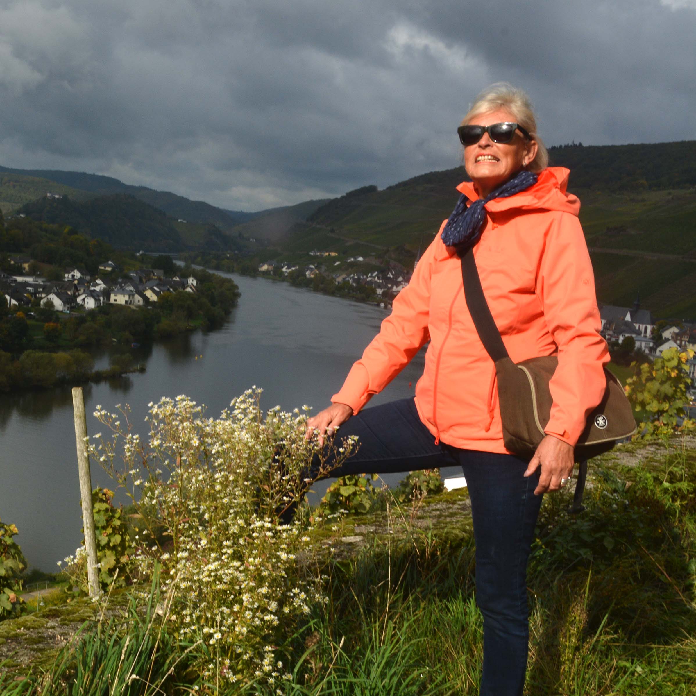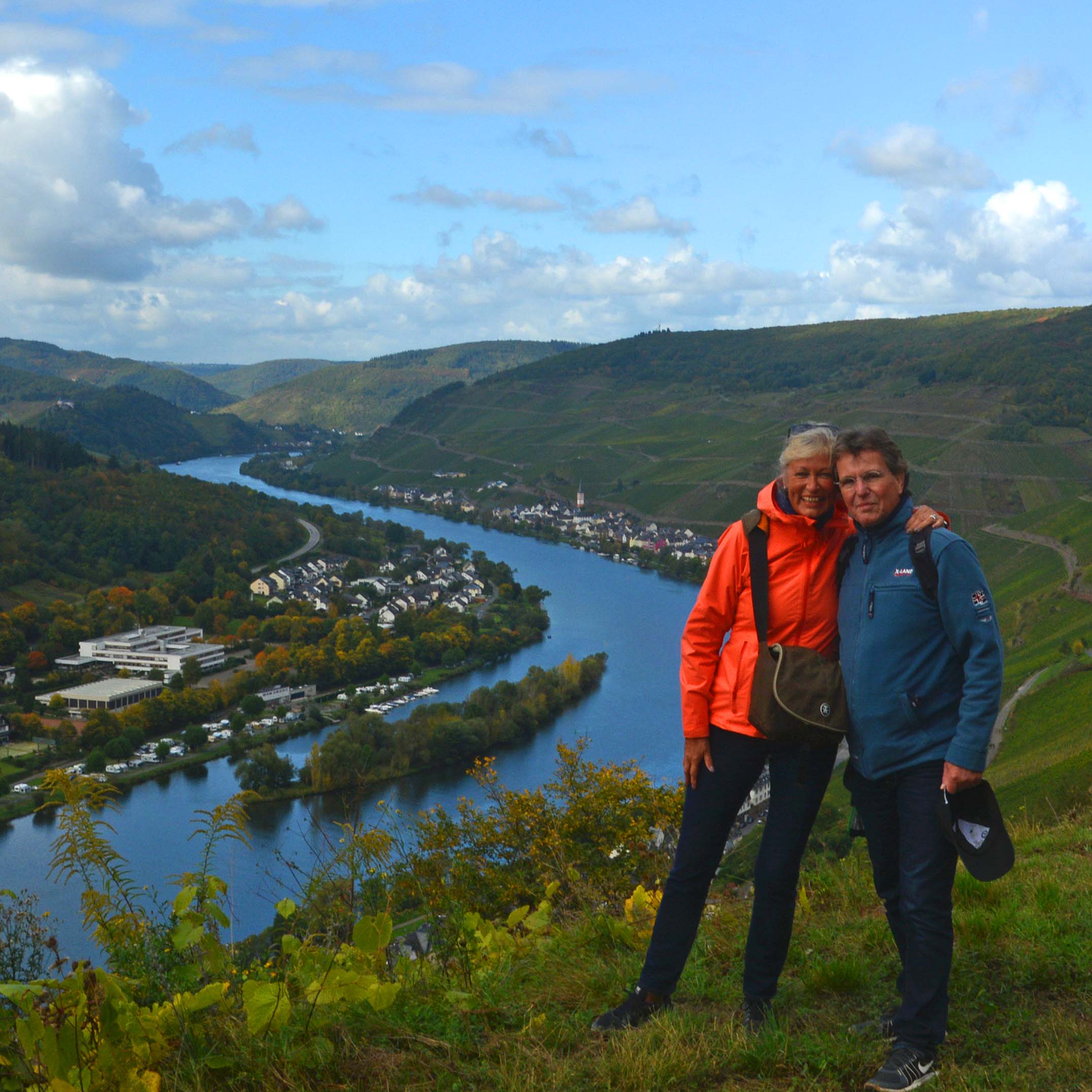 Gegen 13 Uhr verabschieden wir Thomas, Gerhard, Jo und Gitti. Das verbleibende ‚Glücks-Kleeblatt‘ läuft den Weinwanderweg bis zum acht Meter hohen, aus rotem Backstein erbauten, Collis-Turm. Unterwegs begegnen uns zahlreiche Weinwanderer, links das Glas und rechts die Weinflasche in der Hand. Auf der Collis-Plattform geht der Punk ab. Es ist brechend voll. Wir schlabbern bei geiler Disco-Musik Kuchen, Federweißen und Glockenöl, einen hervorragenden Trester. Dabei genießen wir die Sonne und wieder umwerfende Blicke auf die herrliche Mosel-Schleife. Gabi entscheidet sich für den Abstieg über den Collis Steilpfad für Halbmutige. Wir wollen vor dem Abendessen noch abchillen und Sonne tanken.