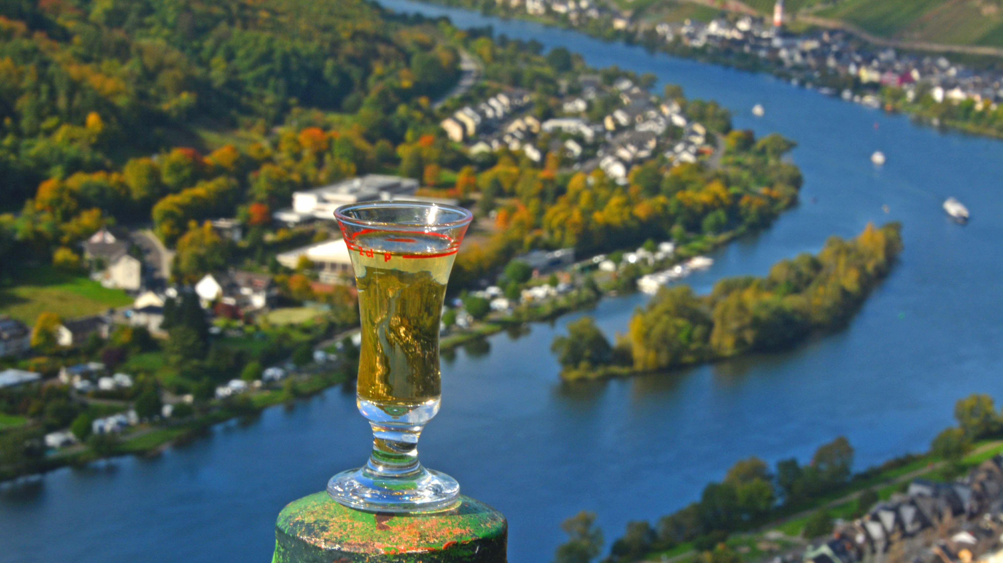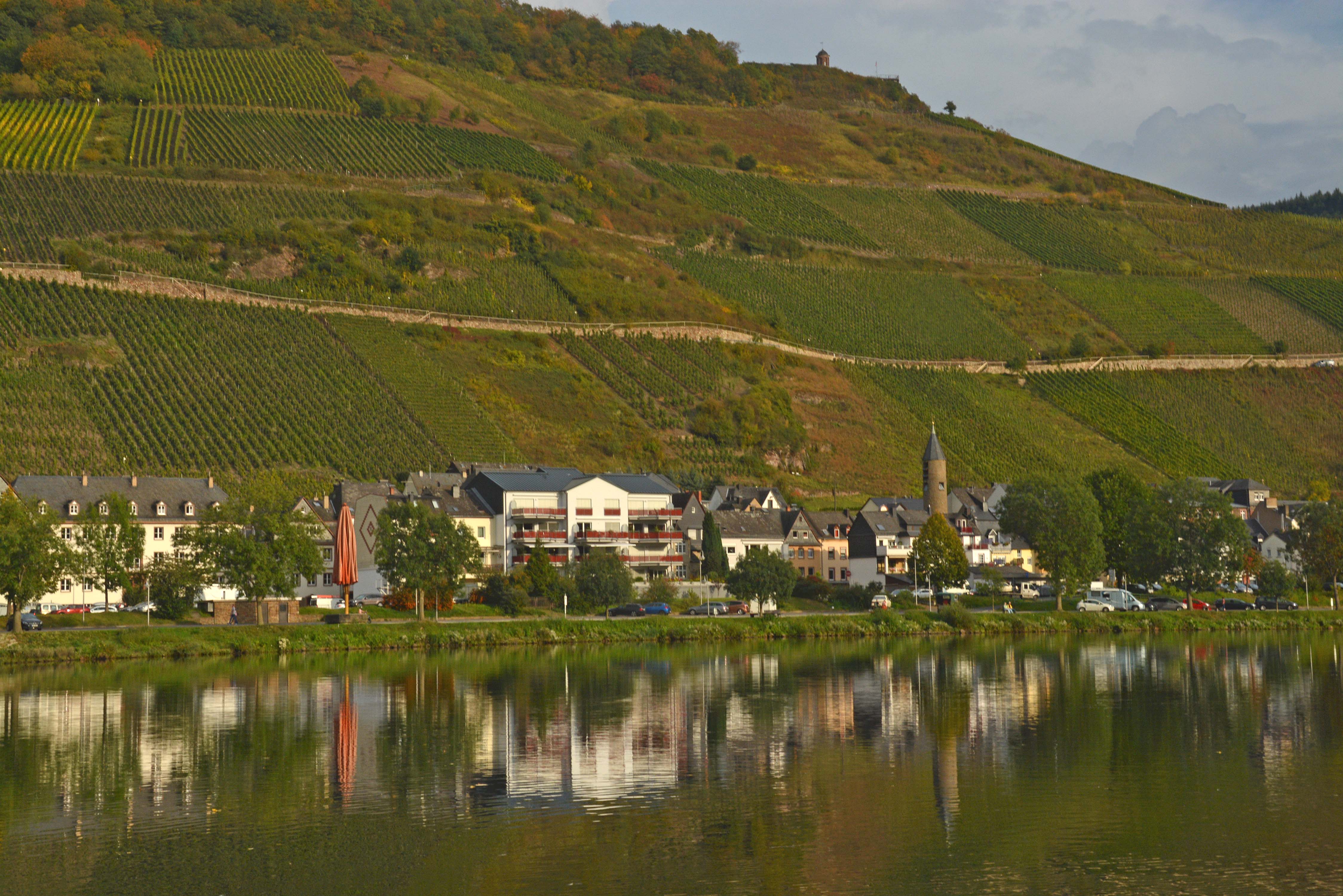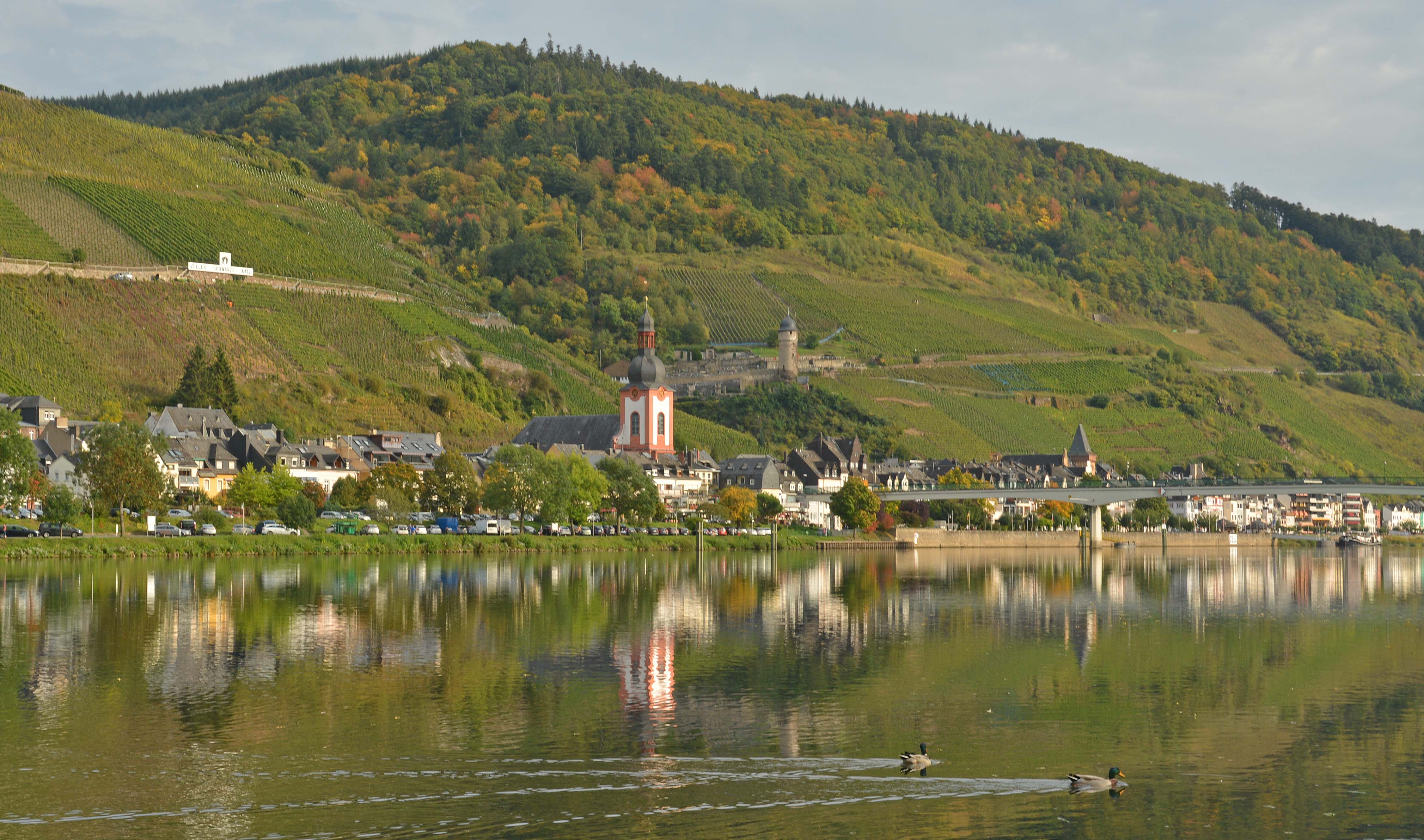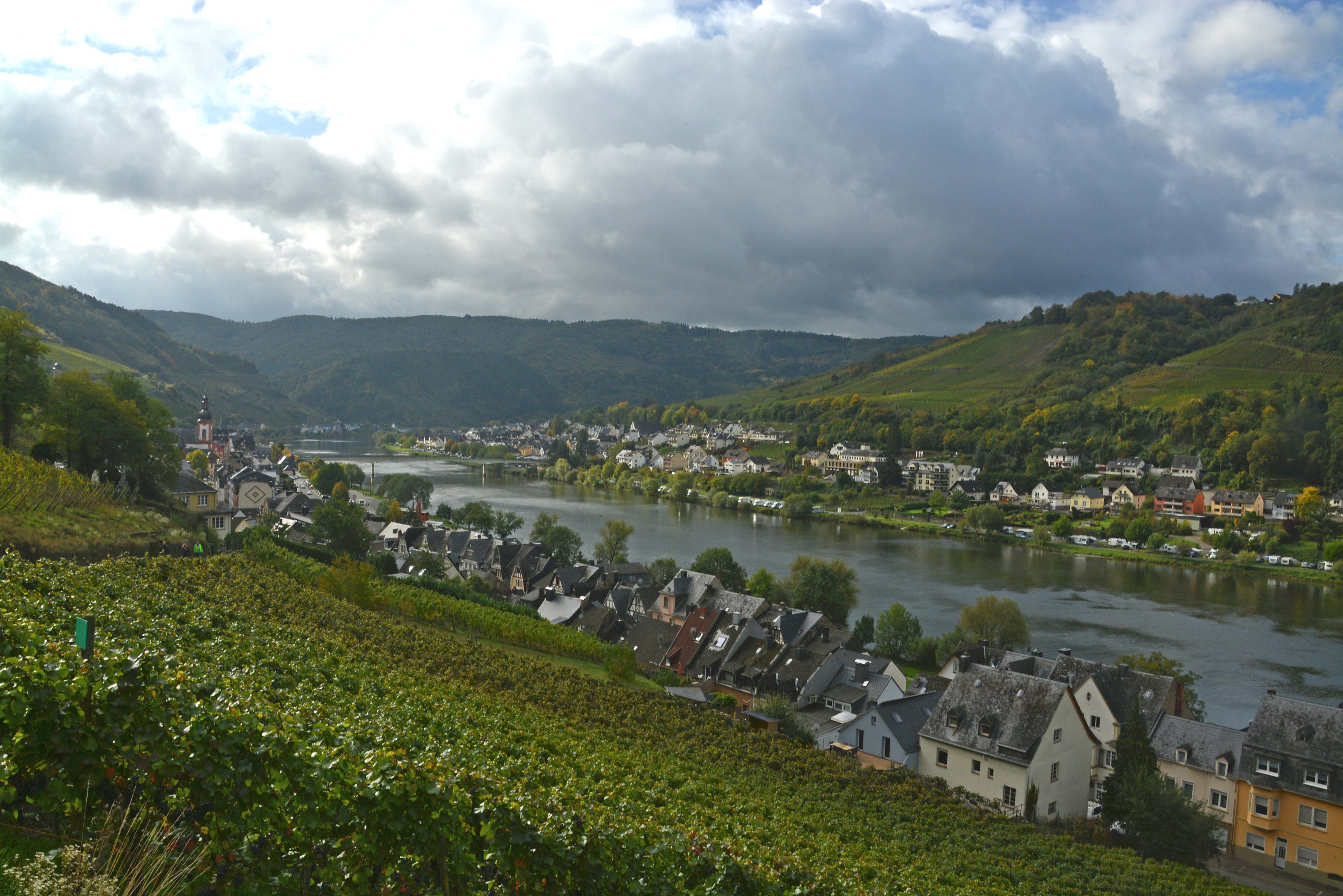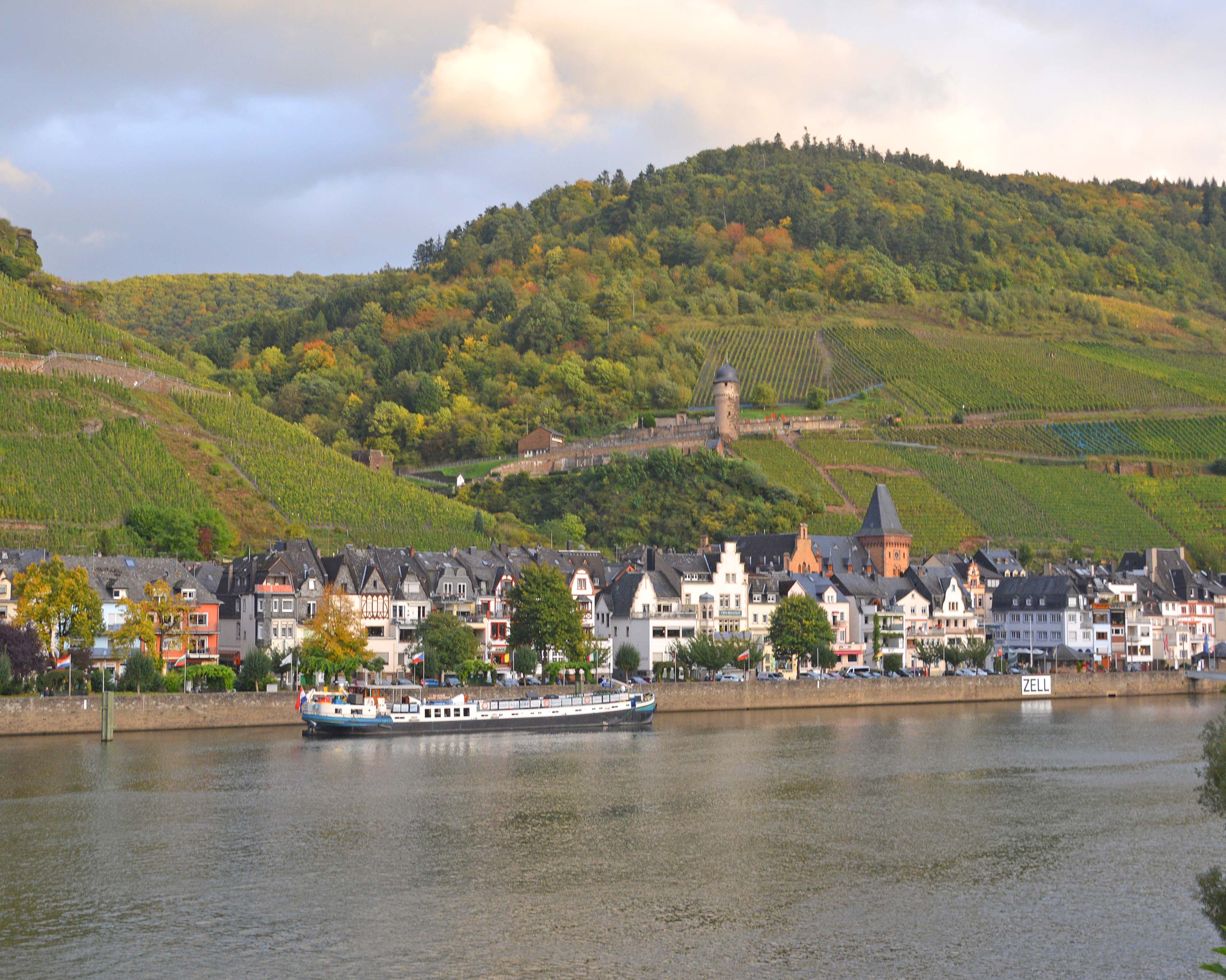 Wir laufen gemütlich durch die westlich gelegenen Weinberge hinauf zum ‚Rieslingtreff Rommeneyweg‘, direkt zwischen den Reben gelegen. Unterwegs genießen wir die wunderbare Mosellandschaft, Blicke auf den ‚Viereckigen Turm‘ im Zeller Bachtal und den ‚Runden Turm‘, der auf fast keiner Ansichtskarte fehlt. Klitzeklein ist der Touri-Betrieb auf der Balduinstraße, der Zeller Zeil, zu erkennen.