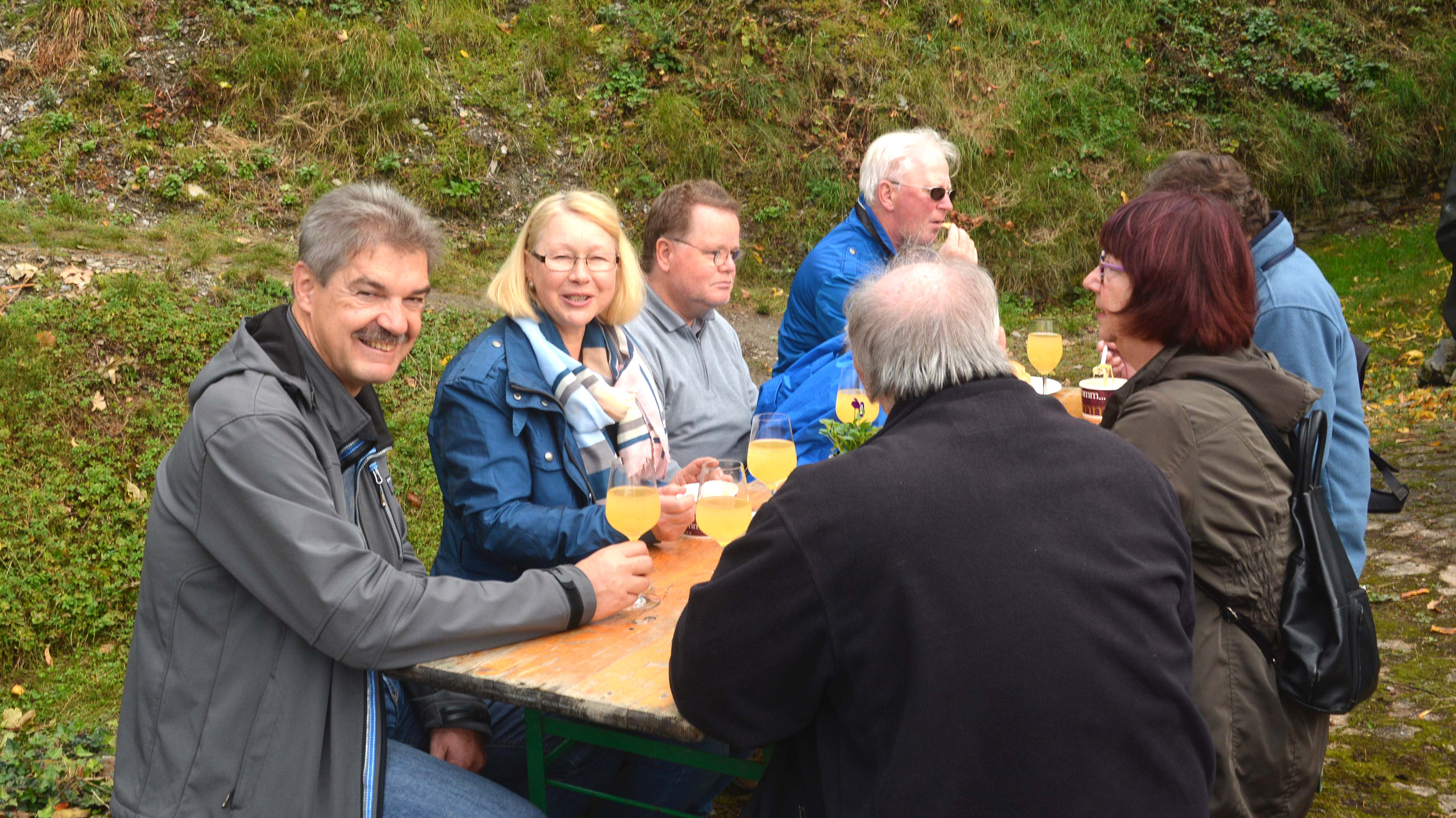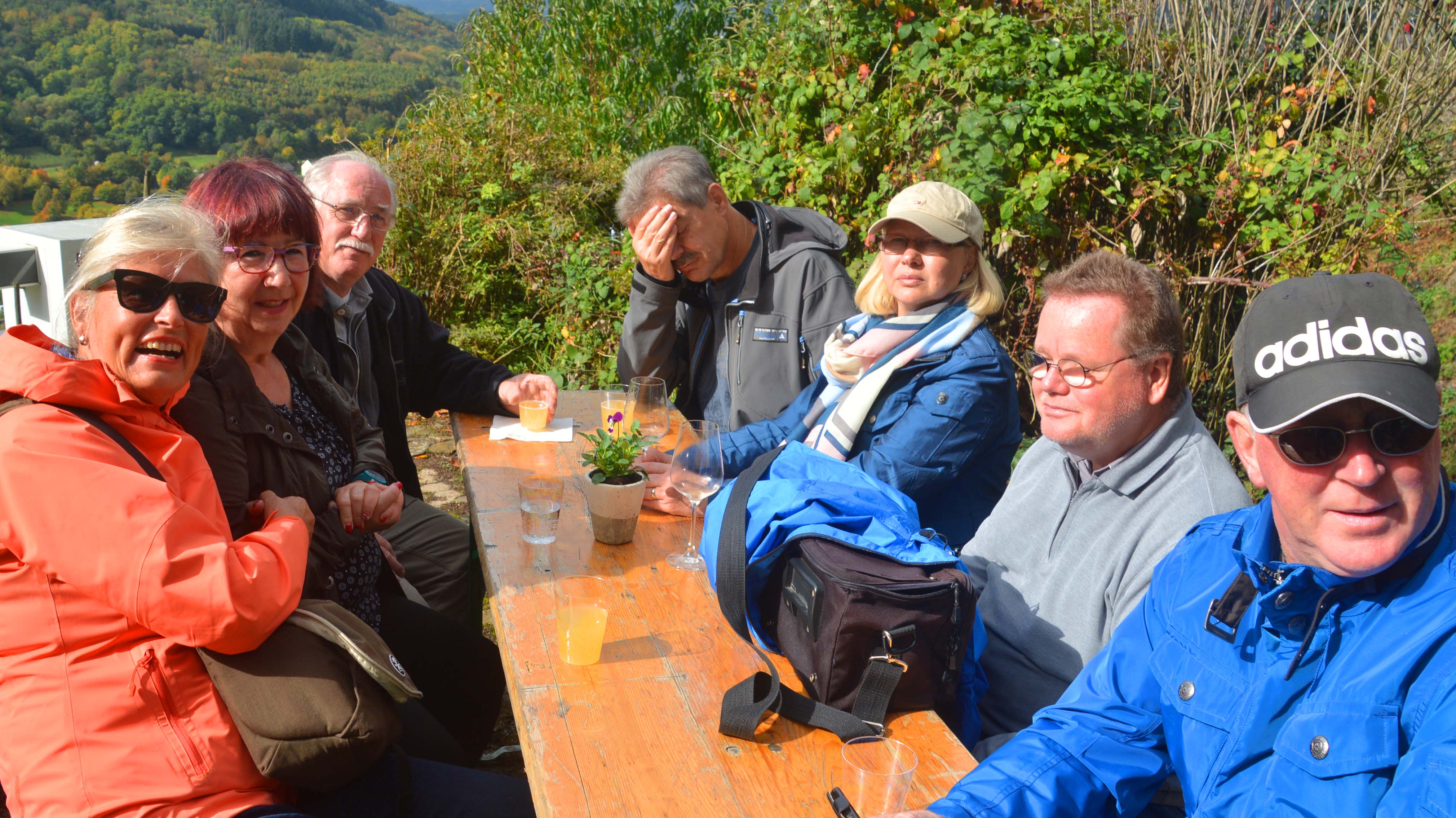 Wir ergattern einen Tisch, süffeln Federweißen, essen Worscht und Lauchsüppchen und quatschen. Wenn sich die Sonne zeig,t ist es wohlig warm. Herrlich! Die meisten Trauben sind schon gelesen. Über manchen Weinfeldern liegt eine Wolke von ‚Maische-Duft‘. Wir beschließen spontan eine Wiederholung der ‚Schwarz-Katz-Wanderung‘ in 2018.