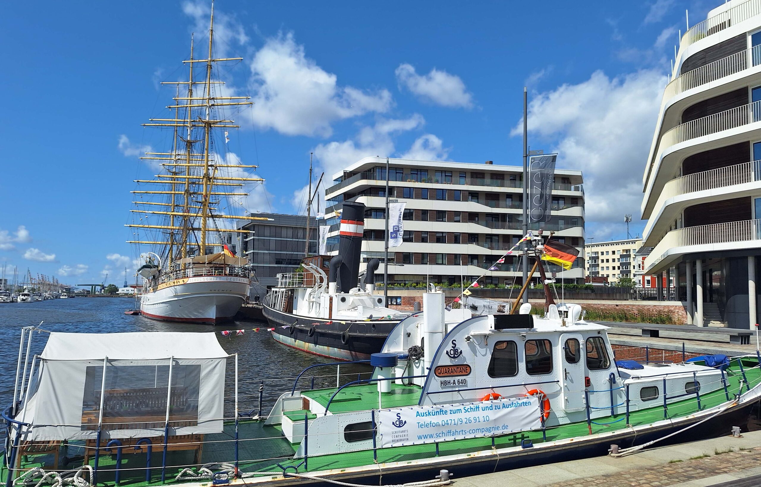 Jetzt meldet sich der groĂe Hunger. Wir finden eine Pizza đ im Columbus Outlet & Shopping Center mit seiner attraktiven Glaskuppel. Auf dem Weg zu einer Eisdiele đŠ kaufen wir neue Sandalen đ©ŽfĂŒr meine Enkelin. Wir kommen an der Backstein-GedĂ€chtniskirche âBĂŒrgermeister Smidtâ âȘ vorbei und treffen auf das ehemalige Segelschulschiff Deutschland â” mit einer LĂ€nge von 86 Metern, dass im Neuen Hafen liegt. Der Dreimaster ist heute Kulturdenkmal. FĂŒr ein paar Bilder schmuggle ich mich auf das Schiff und werde prompt erwischt. Eintritt đïžist obligatorisch!! Den Kindern ist das voll peinlich!