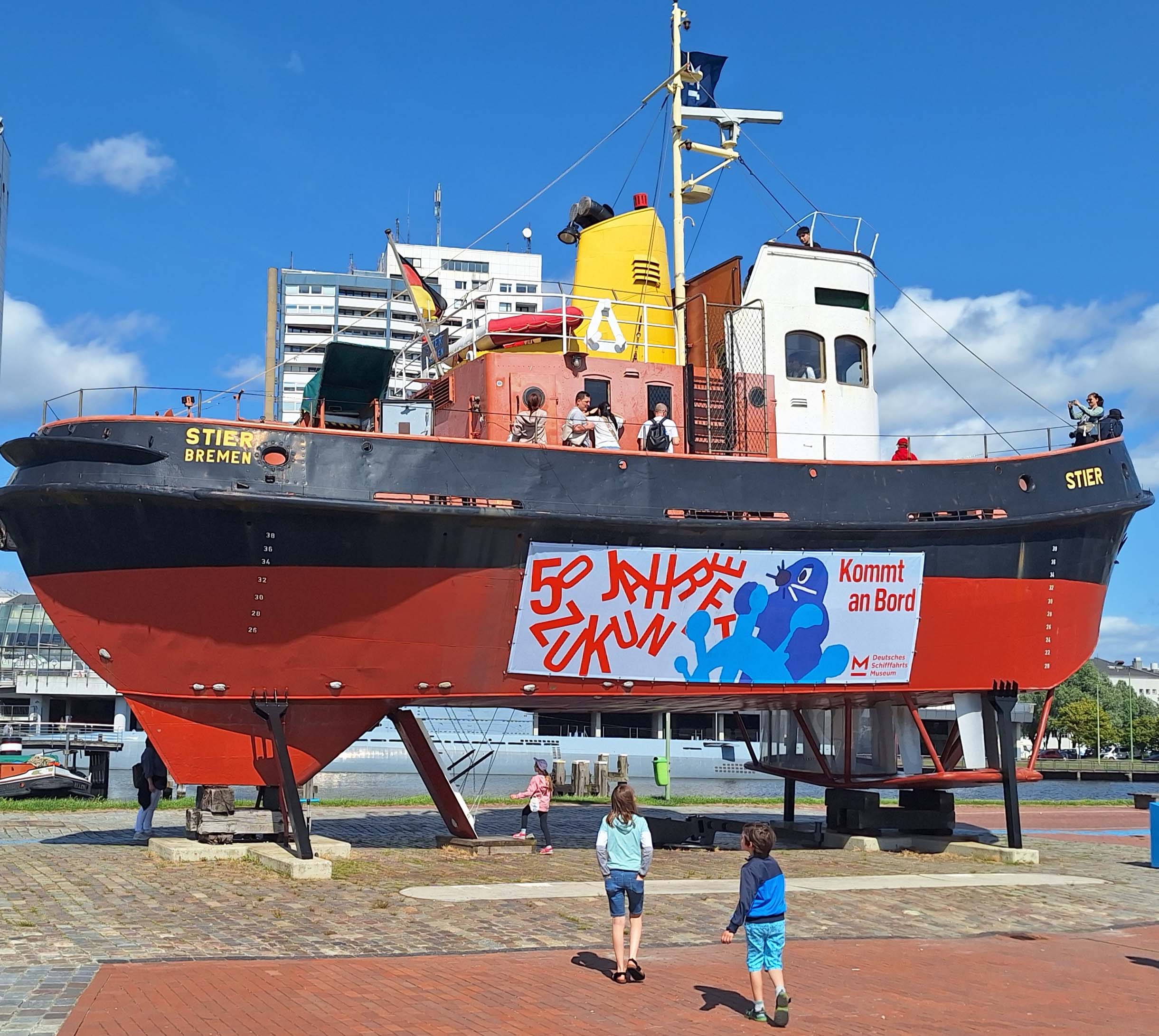 Zum Abschluss des ereignisreichen Tages treffen wir im Museumshafen auf den Wassertrecker âStierâ, einem speziellen Hafenschlepper, der seit fast 50 Jahren im Museumshafen zu besichtigen ist. Die Kinder sind Feuer und Flamme đ„ und erklimmen das Schiff bis zum Deck. SpĂ€ter lesen wir, dass sie nur in Begleitung von Erwachsenen hinauf dĂŒrfen.