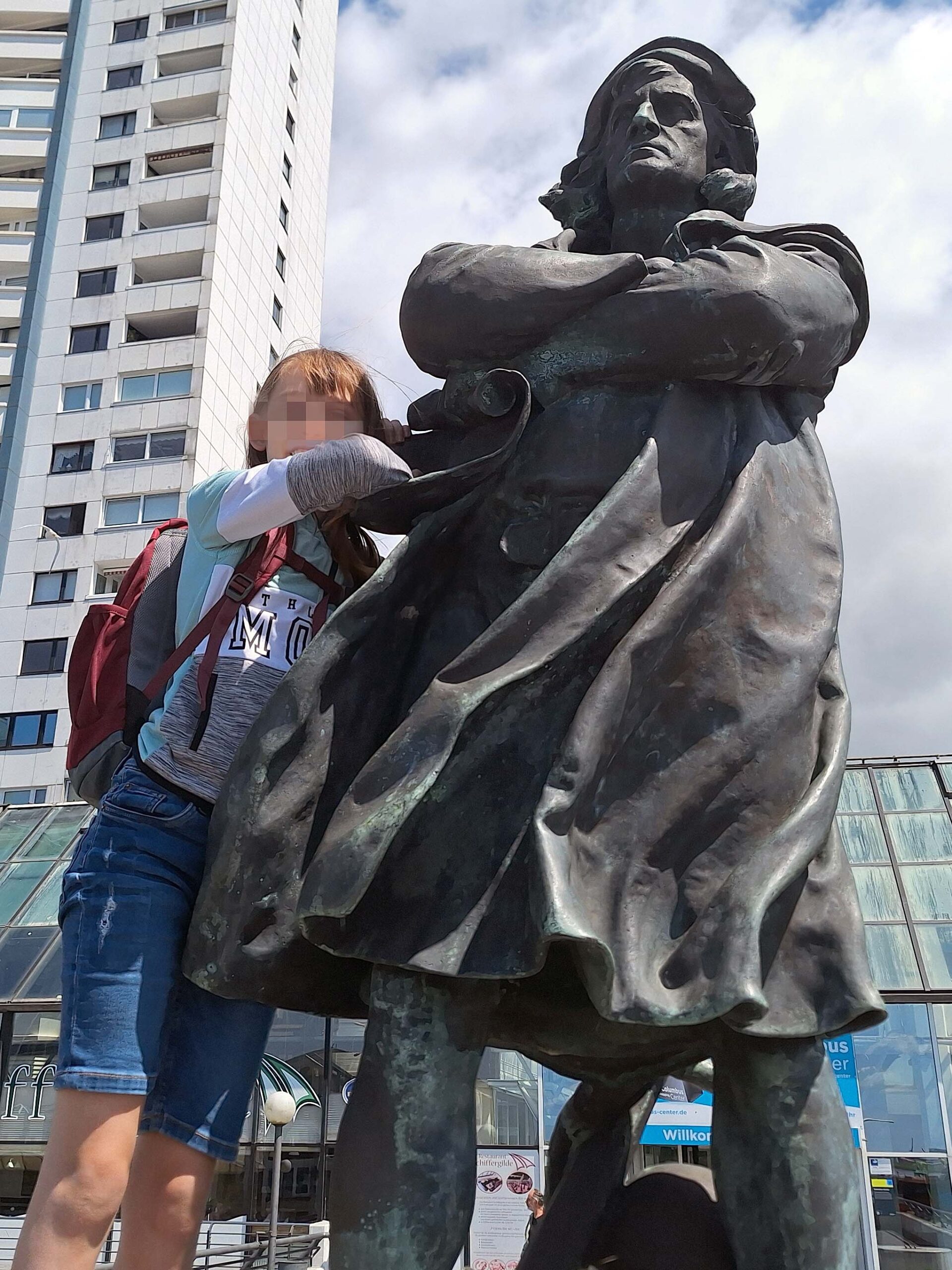 An der FuĂgĂ€ngerbrĂŒcke zum Columbus Center treffen die Kids auf das Denkmal Christoph Kolumbus und klettern hinauf. Er aber richtet seinen Blick đïžnur in die Ferne.