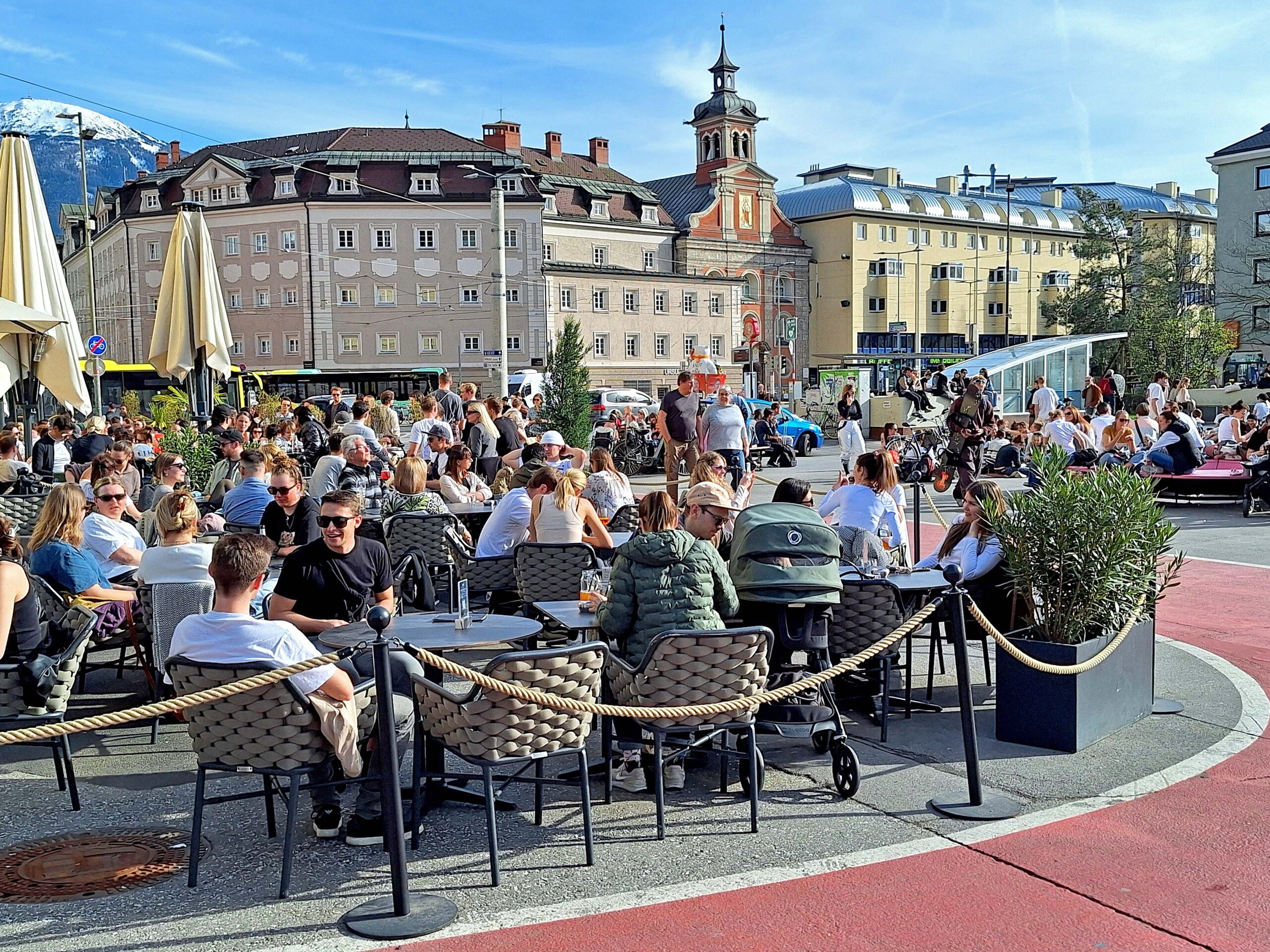 Kurz danach stehe ich auf dem riesigen Marktplatz am Inn. Hier ist richtig was los! Hunderte genießen die warmen Sonnenstrahlen. Es ist ein unbeschreibliches Gefühl, Teil dessen zu sein.