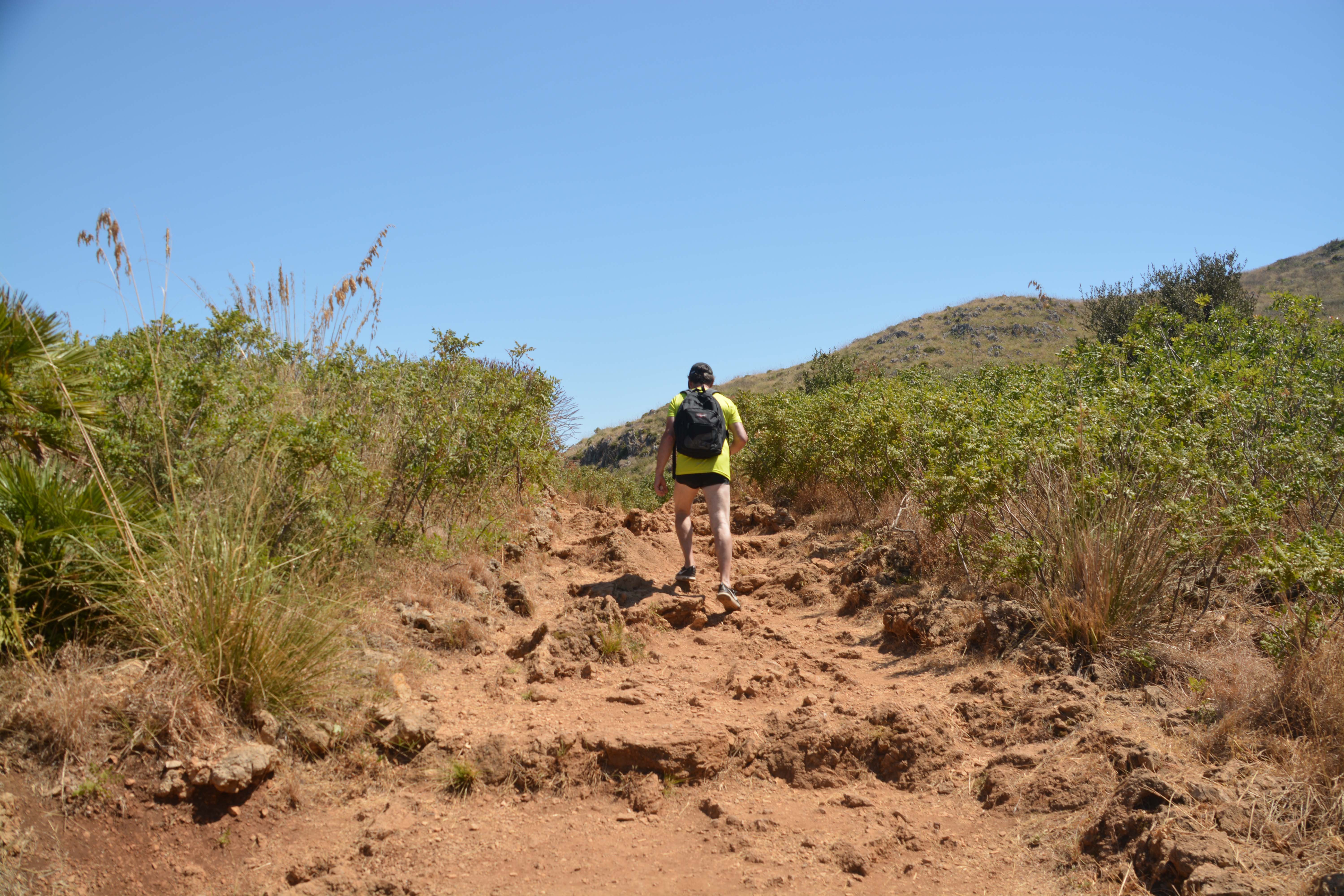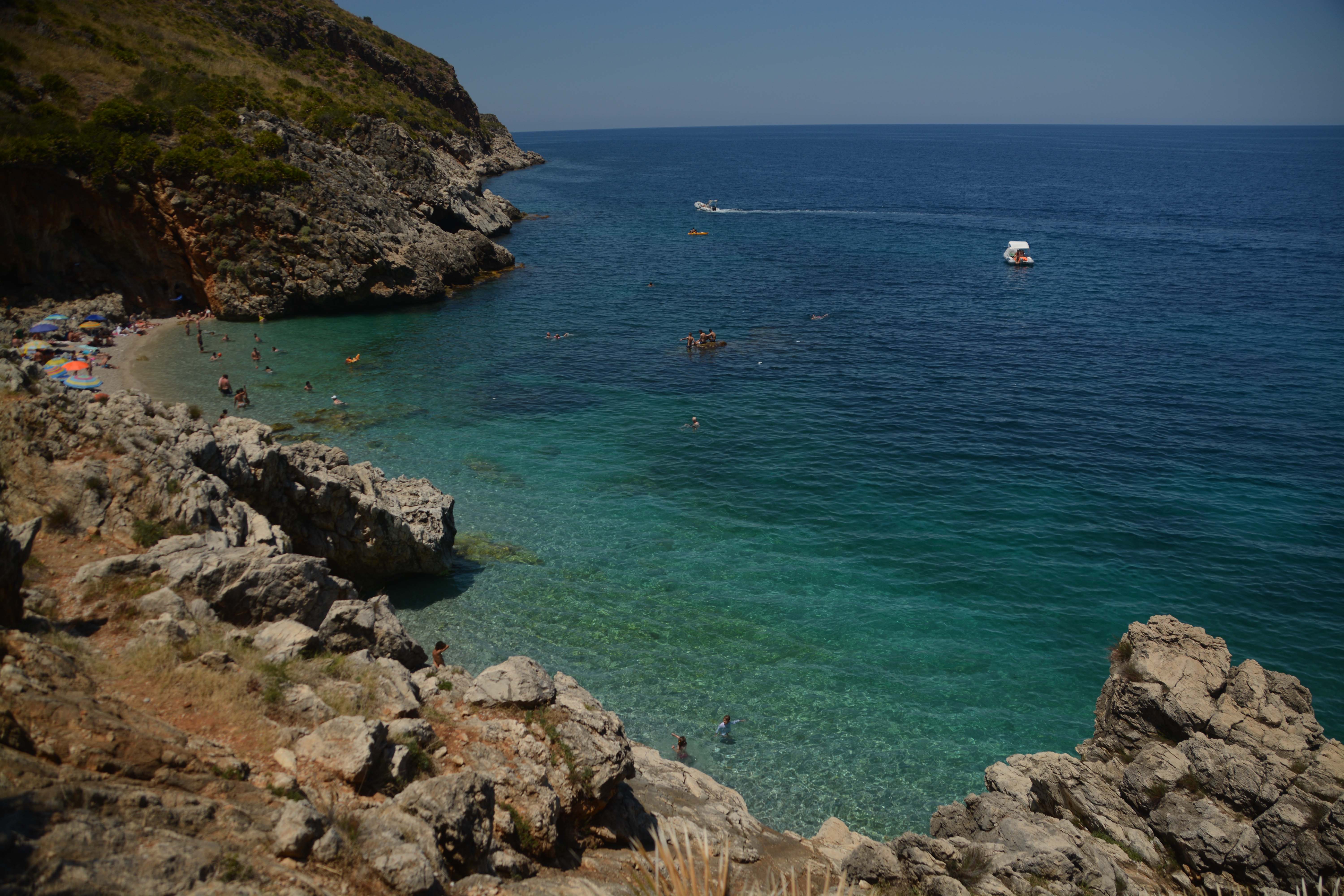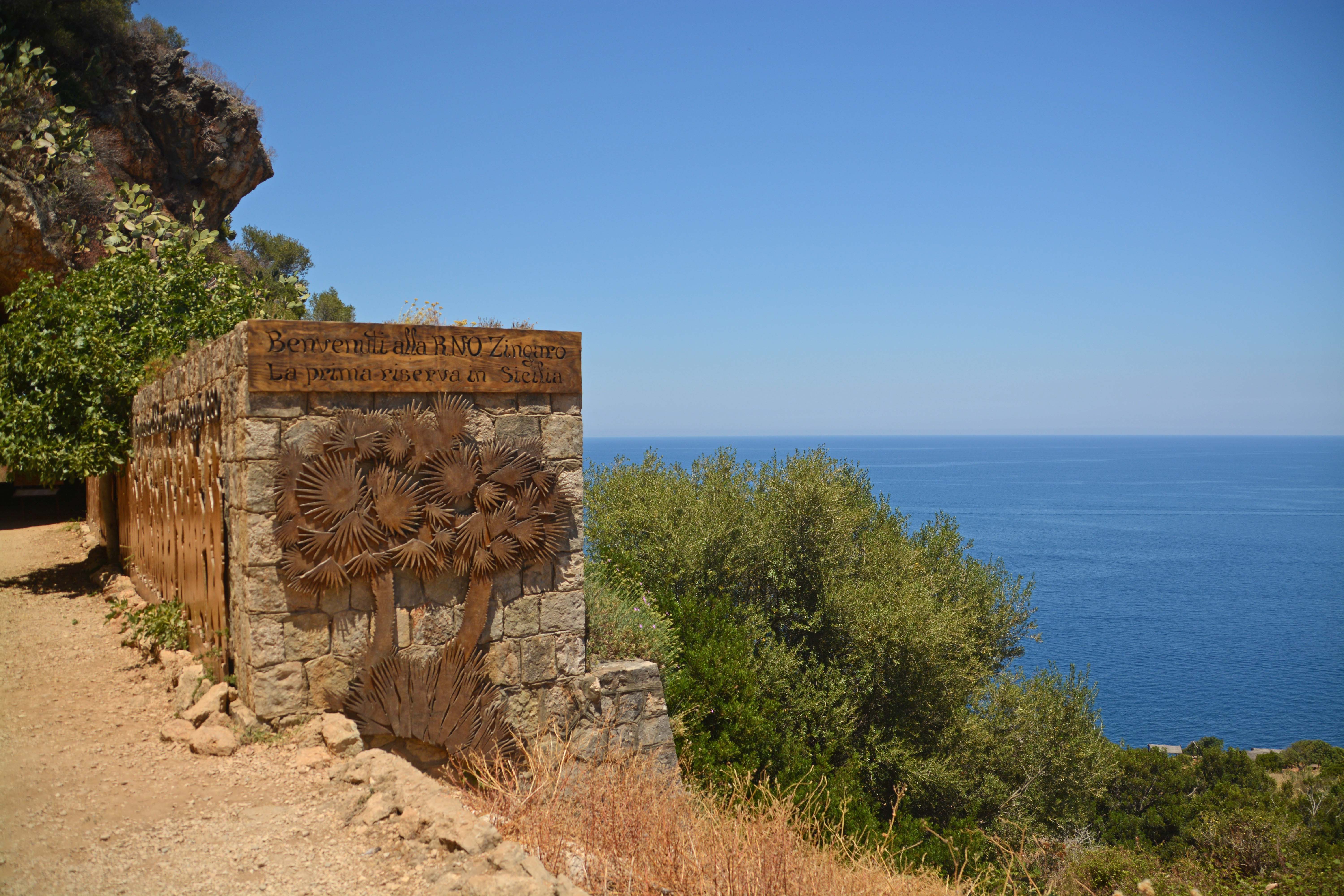 Lo Zingaro ist das erste Naturschutzgebiet Siziliens, heute sind es 98. Der Park ist eine rauhe Schönheit und bietet sechs Abstecher zu glasklaren, azurblauen Badebuchten mit Kiesstrand. Wahrzeichen des Parks sind die bis zu 1-2 Meter hohen ‚Palma nana‘, die Zwergpalmen. Goethe beschrieb sie so: Sie haben niedliche Beschen die sich mit wenigen Änderungen zum Facherdienst nutzen könnte. Davon gibt es hunderte. Oberhalb des sieben Kilometer langen steinigen, bergauf- und bergab führenden ‚Sentiero Costiero‘ blicken wir auf bizarre Kalkformationen, schroff, karg und steil. Es ist sehr heiß und der angeblich leichte Trekkingpfad verläuft in der prallen Sonne, teilweise bis zu einer Höhe von 100 Metern über dem stahlblauen Meer mit gigantischer Fernsicht auf das Mare Tirreno. Nur manchmal weht ein leichtes Lüftchen vom Meer zu uns hinauf. Schattenplätze zum Ausruhen sind begehrt, aber so gut wie gar nicht vorhanden. An dem in der Ferne sichtbaren Torre dell’Uzzo messen wir, wie weit wir kommen. Zig weiße Boote, Bötchen, Tourischiffe und Motoryachten touren die Küste entlang, manche spucken für 5 Minuten Badegäste aus.