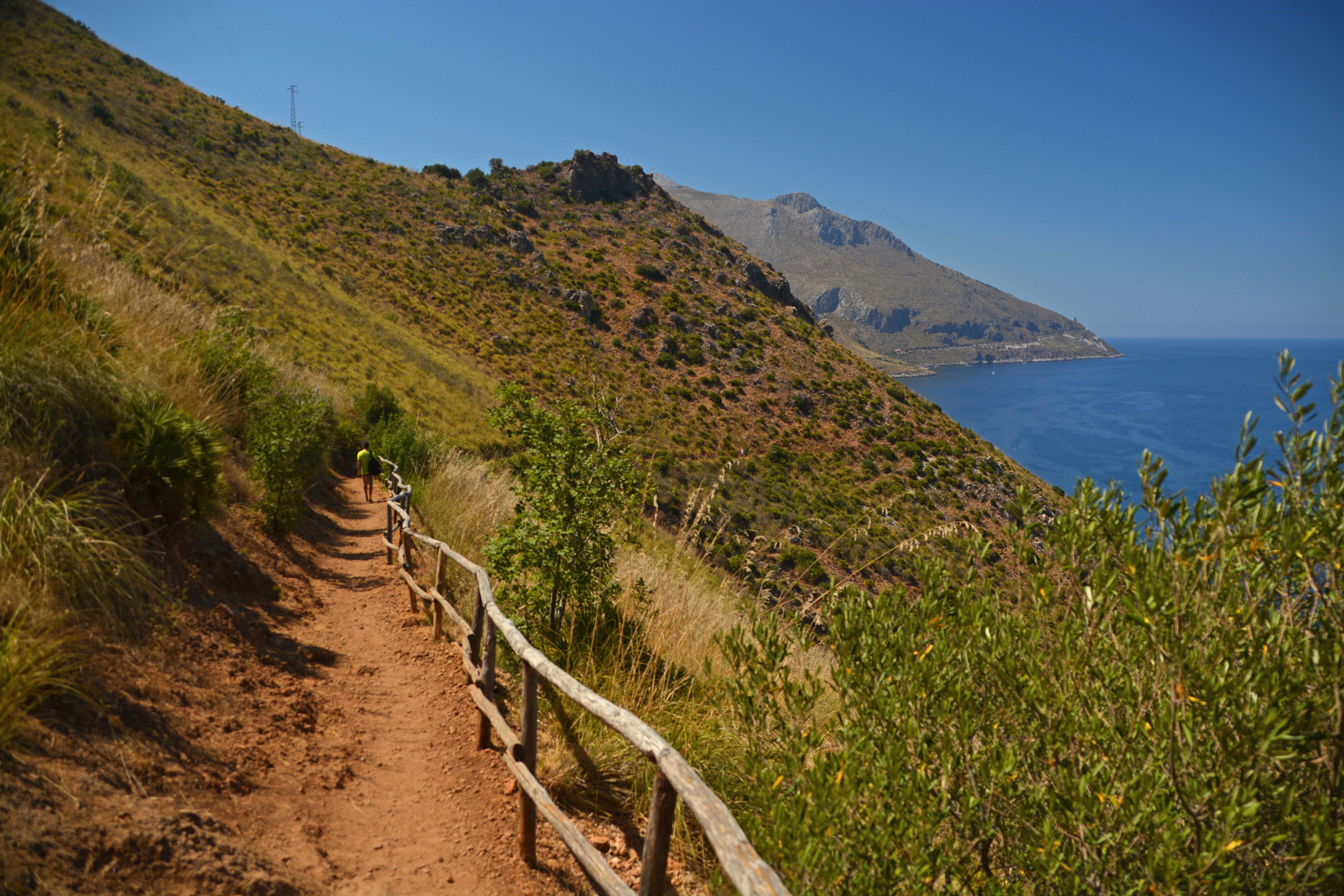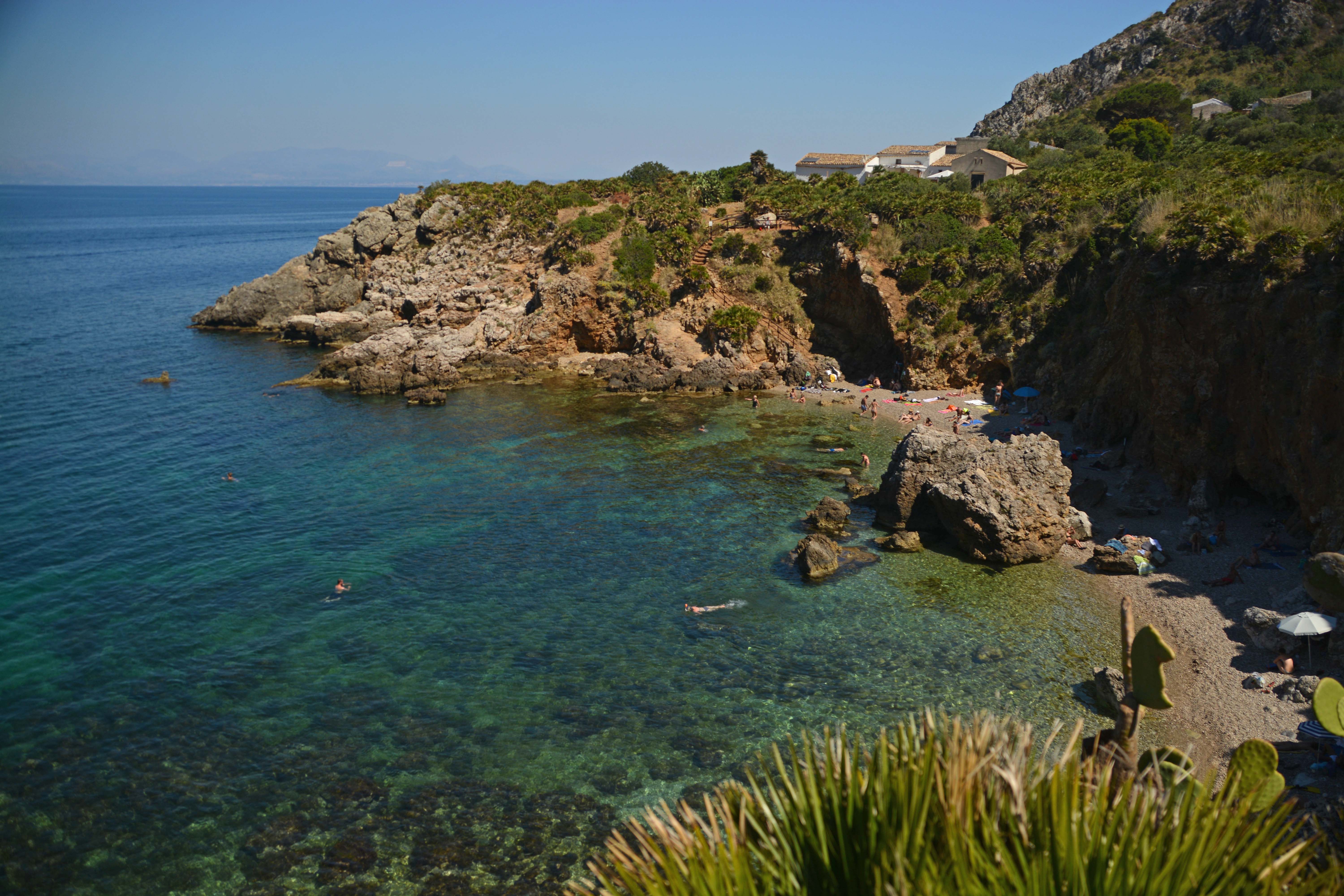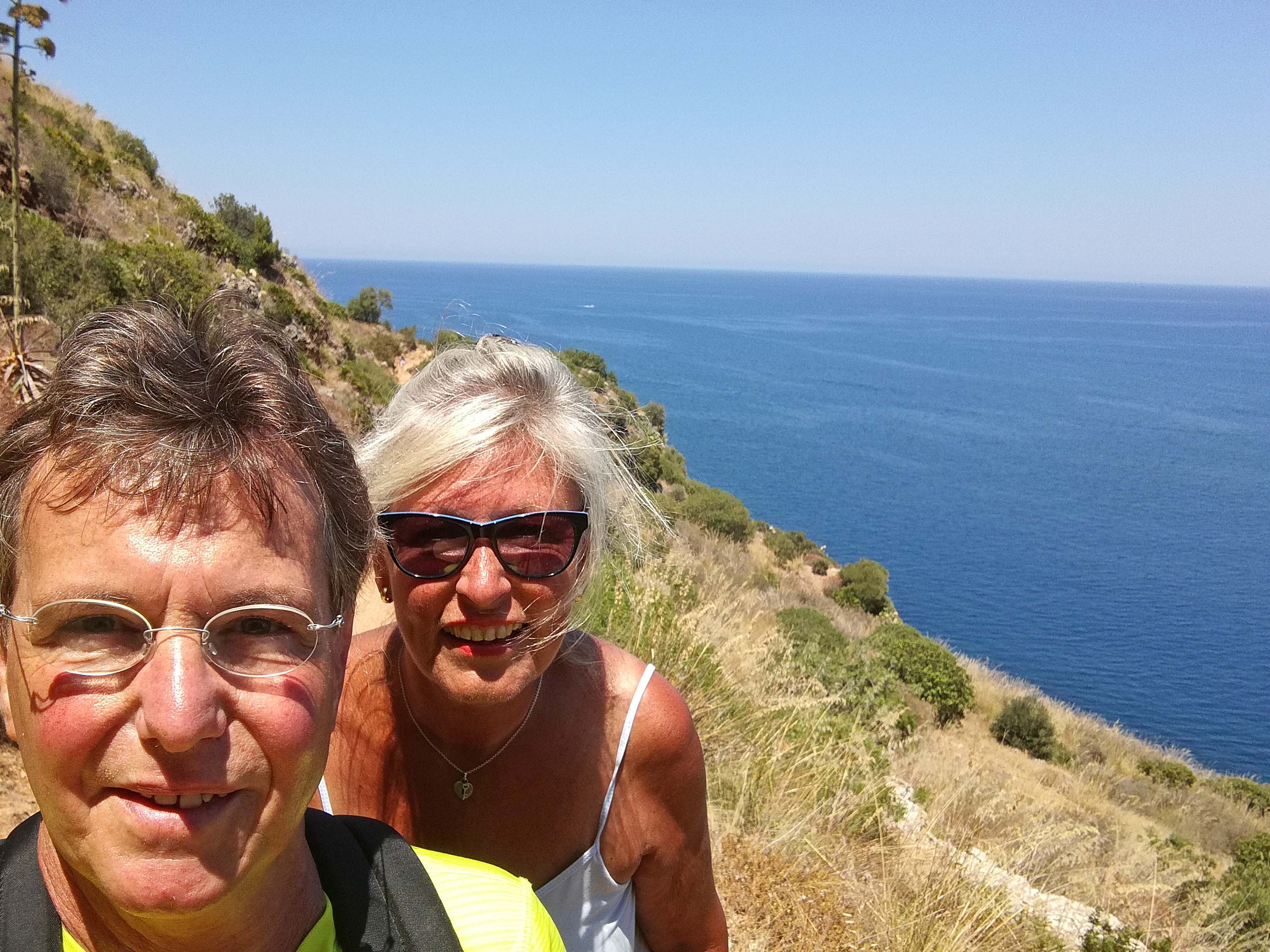 Fiete ist erst kurz nach 12 startklar. Auf dem Weg zum Südeingang des Wander- und Badeparadieses kaufen wir einen Topfuntersetzer aus Olivenholz, bewundern Castellamare del Golfo aus der Vogelperspektive und entdecken die ‚Faragliono von Scopllo‘, kleine Felsen im Meer, die den Seeleuten in der Antike als Leuchtfeuer dienten. Nach 12 Kilometern schlecht ausgeschilderter Strecke und kurvenreicher Fahrt werden wir von einem wild hin- und her fuchtelnden, strohbehüteten Parccheggio-Wächter abgefangen. ‚No Campere, no Campere‘ ruft er uns weiter wild gestikulierend zu. Wir diskutieren mit ihm und drehen nach erfolgloser Überredungskunst um. Wir nehmen den in 300 Meter entfernten Ausweichplatz. Wiedr reden wir mit Engelszungen, haben diesmal aber Erfolg. Natürlich nur gehen mehr Kohle. ‚Campere double price!!‘ Wir löhnen 10 €uro, haben ein sicheres Standplätzchen und nicht weit zum Parkeingang.