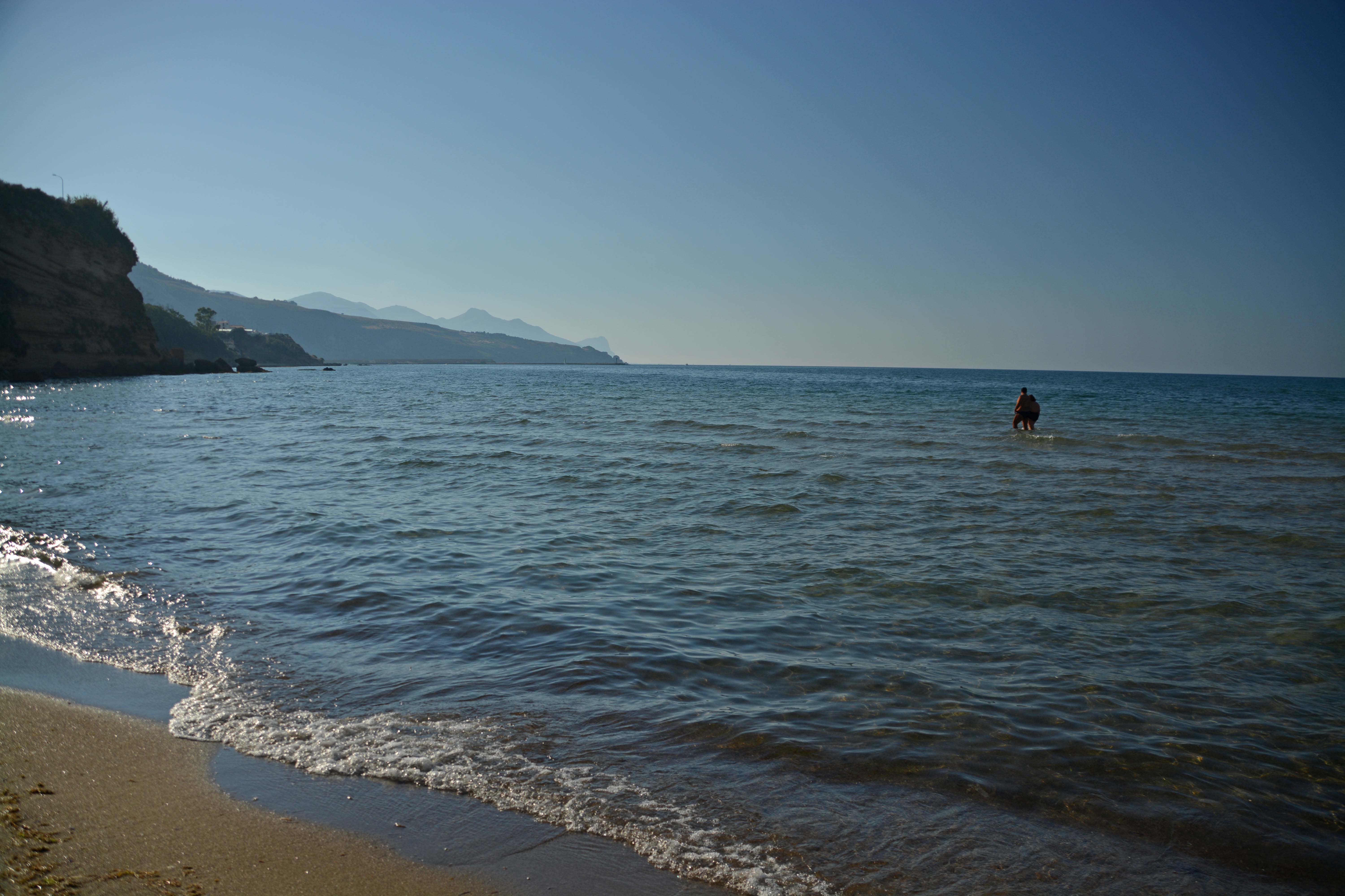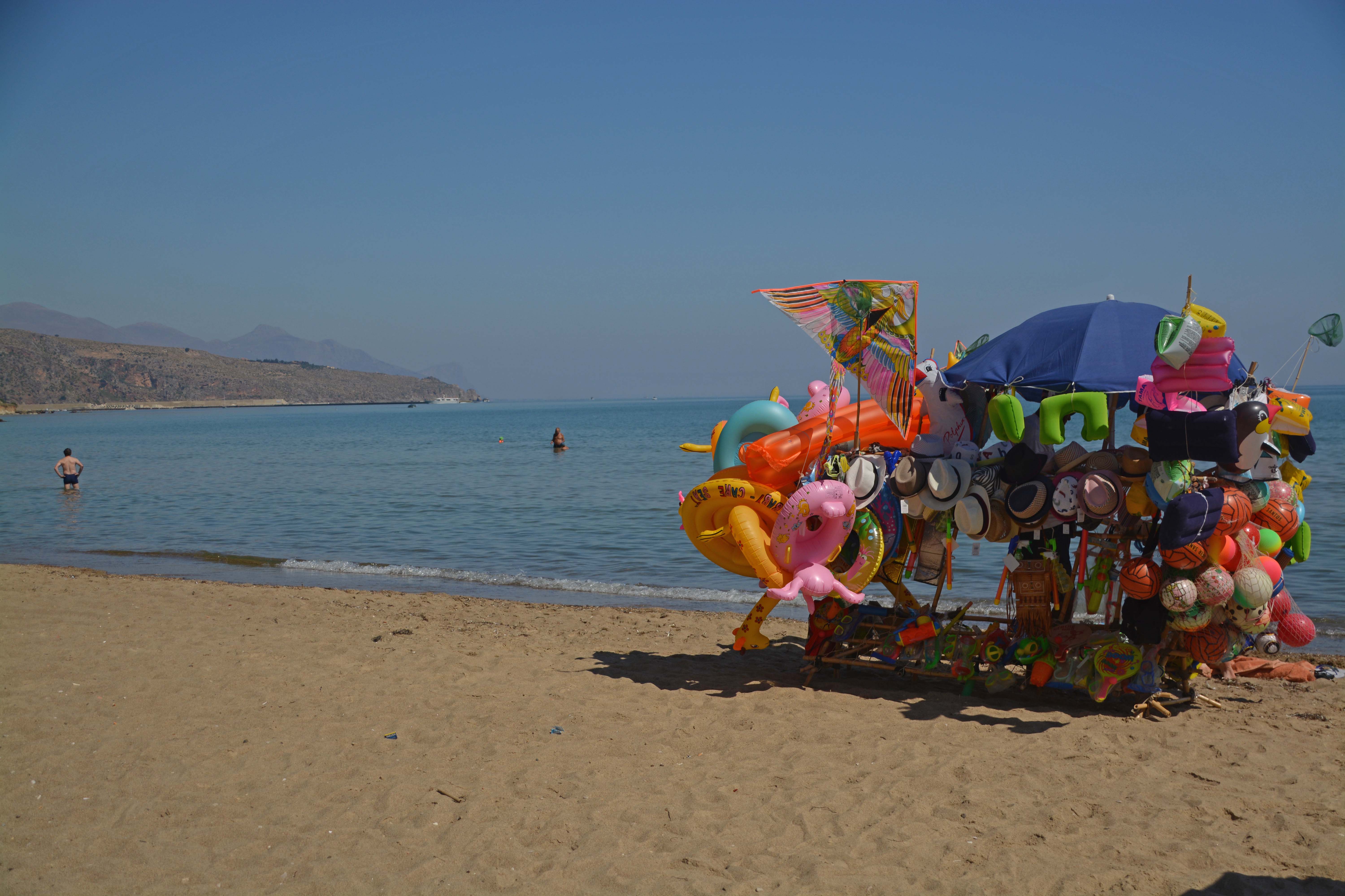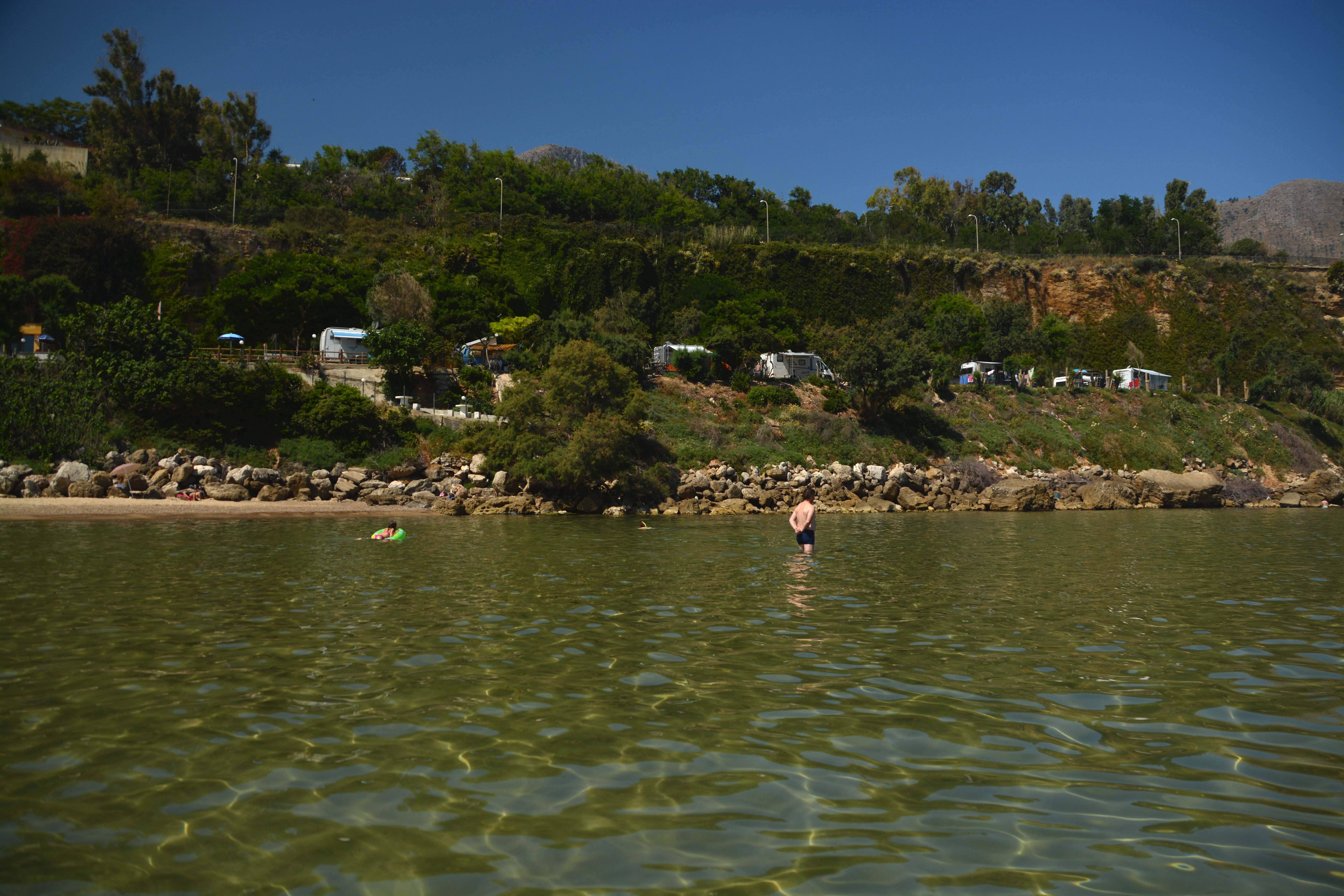 Wir frühstücken ausgiebig und entschließen uns für die Wanderung mit Badestopps im Naturreservat ‚Zingaro‘. Erst aber ziehen wir Badesachen hier an, spurten die 80 Meter zum Strand hinunter und stürzen uns in die Fluten. Es ist sonnig, 28 Grad, leicht diesig, alles im grünen Bereich. Das Meer hat traumhafte Badetemperaturen. Klaus schwimmt zu den Felsen unterhalb des Campings, um Fische zu beobachten, ich genieße die türkisfarbenen Stellen und aale mich wie ein Fisch im Wasser und der Sonne. Einfach herrlich. Ein Strandverkäufer schleppt allerlei Bade-Spielzeug mit einem akrobatisch zusammengeschusterten Gestell herum. Wir trödeln.