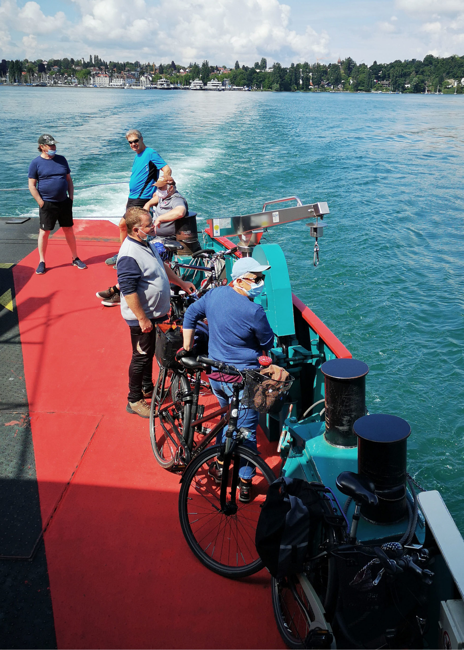 Kurz vor Frierichshafen City verlieren wir uns auch noch. Ein Teil kommt am Schlosssteg an, der andere landet direkt an der Uferpromenade. Gegenüber des neunstöckigen eisernen Aussichtsturms direkt an der Hafenmole legen wir eine Chill-Snack-Stunde ein, bis die nächste Fähre nach Romanshorn ablegt. Um auf den eiserner Hafenturm zu steigen, fehlt uns die nötige Zeit. Ich muss also schweren Herzens auf die fantastische 360-Grad-Rundumsicht verzichten. Auch ein Stadtrundgang ist nicht mehr drin.