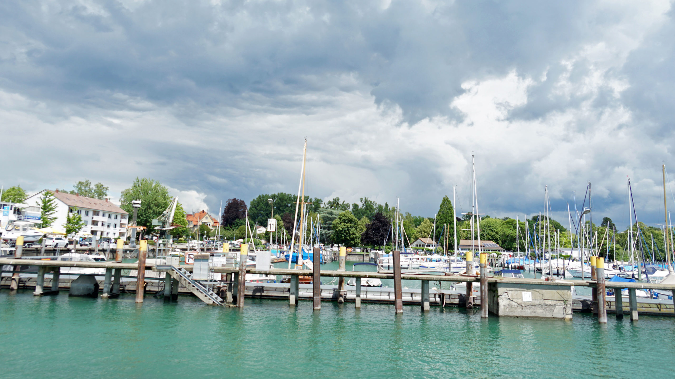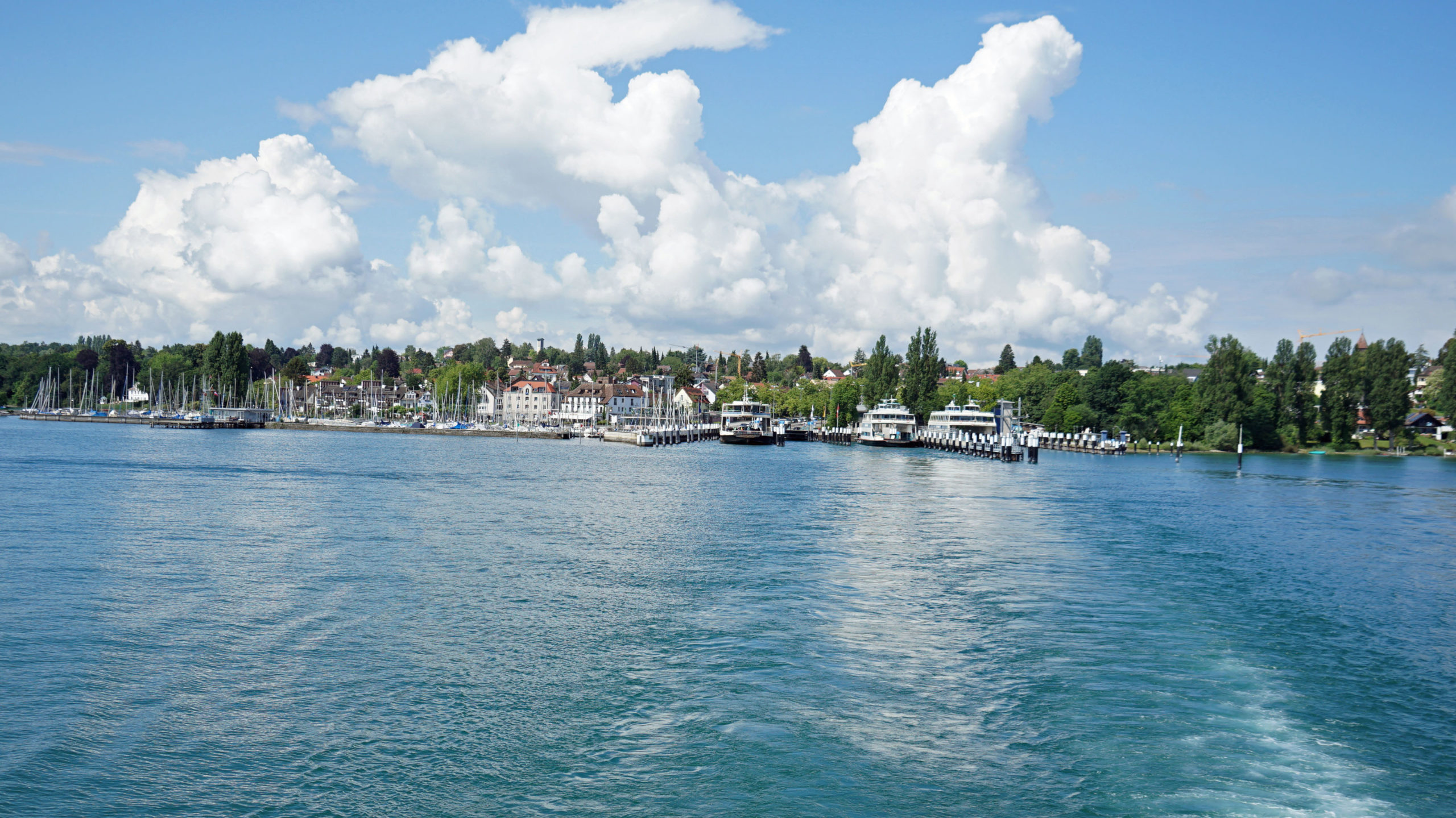 Die Fähre verbindet das schwäbische Nordufer mit dem schweizerischen Südufer des Bodensees. Und nach einer ¾ Stunde kommen wir in Romanshorn im Alpenländli an. Grüezi! Der größte und bedeutendster Schweizer Hafen liegt an der breitesten Stelle des Bodensees.