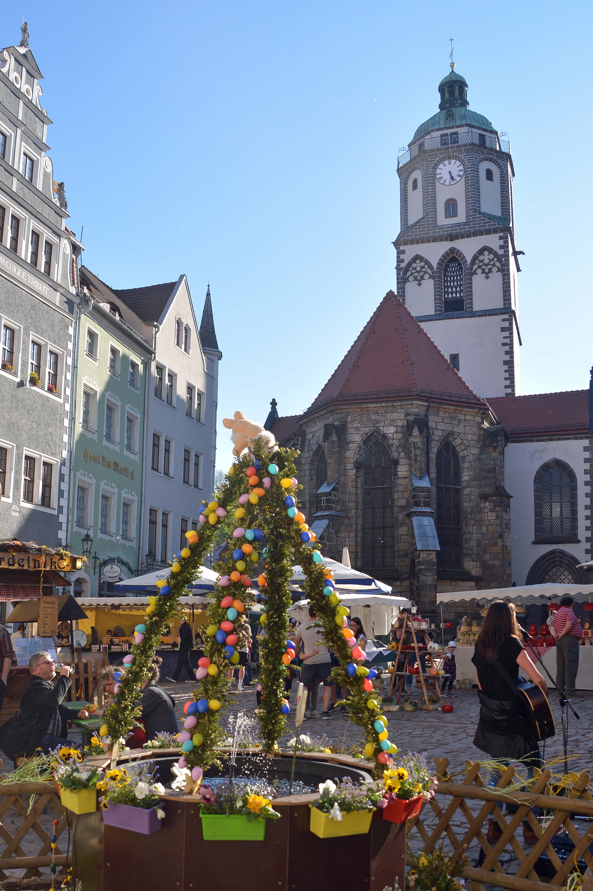 Wir schlendern durch die kopfsteingepflasterten Gassen, die mit zahlreichen Ostermarkt-Ständen bestückt sind. Mittelpunkt ist der gemütliche Marktplatz mit seinem spätgotischen Rathaus, einem Prunkbau aus dem 15. Jh. Besonders die Giebel machen was her. Zahlreiche Bürgerhäuser aus der Renaissancezeit und die spätgotische Frauenkirche runden das Bild ab. Sechs Mal täglich erklingt im Turm das älteste Glockenspiel der Welt aus 37 Meissner Porzellanglocken. Wir dürfen das einmal hören.