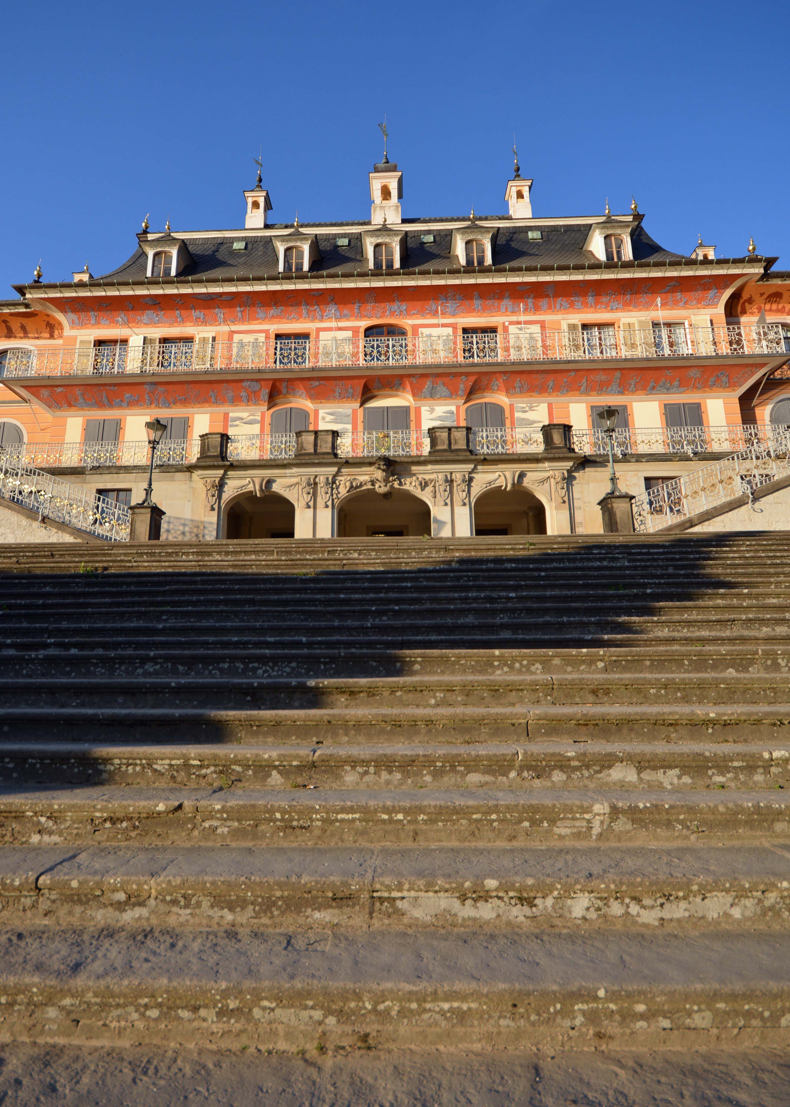 Die barocke Anlage liegt unmittelbar an der malerischen Elb-Flusslandschaft. Von der einstigen Sommerresidenz des Sächsischen Hofes führt eine von Sphinxen eingefasste Treppe zur Elbe hinab, an denen die kurfürstlichen Gondeln anlegten. Ich verweile ein paar Minuten und stelle es mir bildlich vor. Im übrigen steht der Thronsessel August des Starken hier im Schloss.
