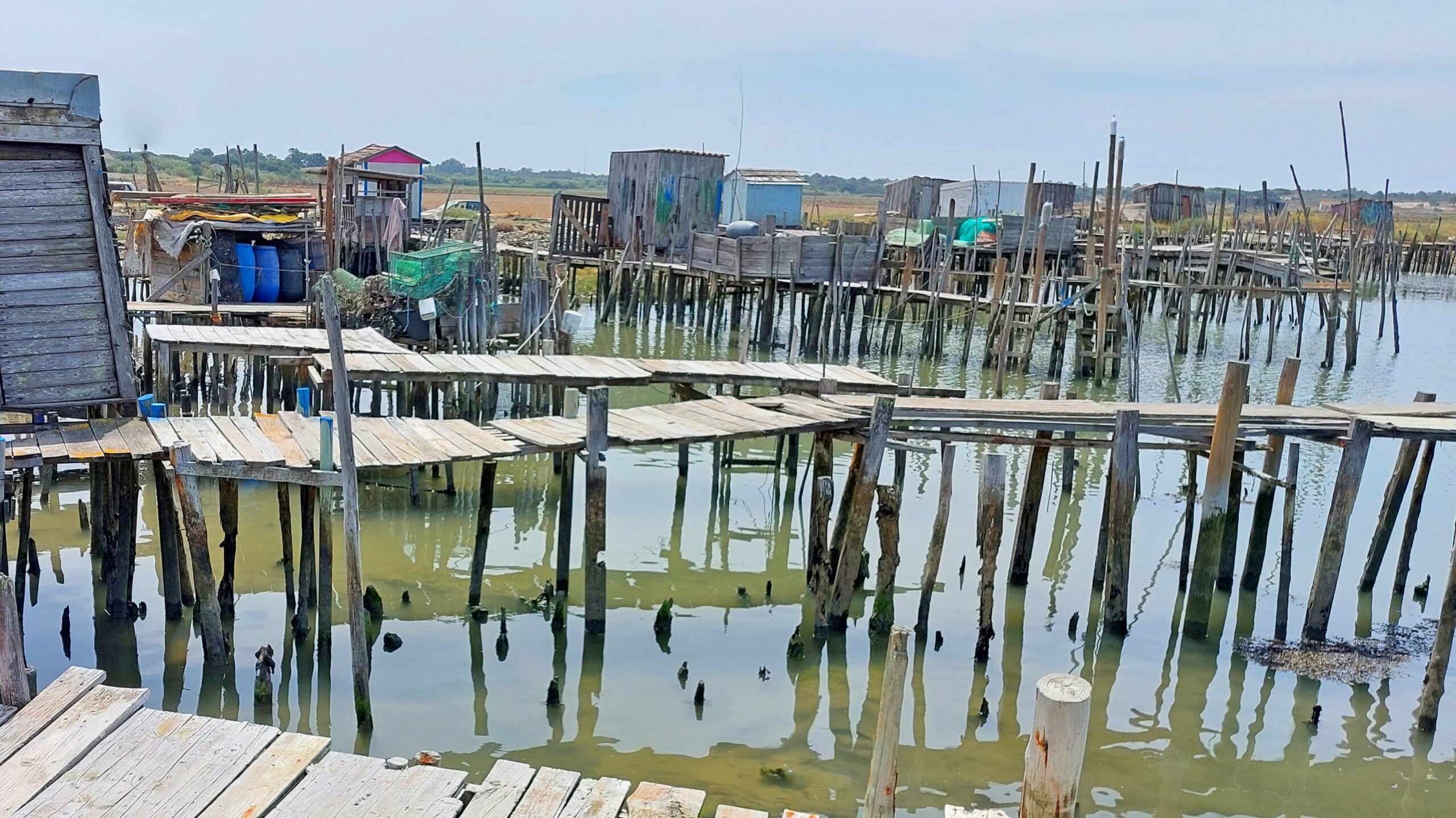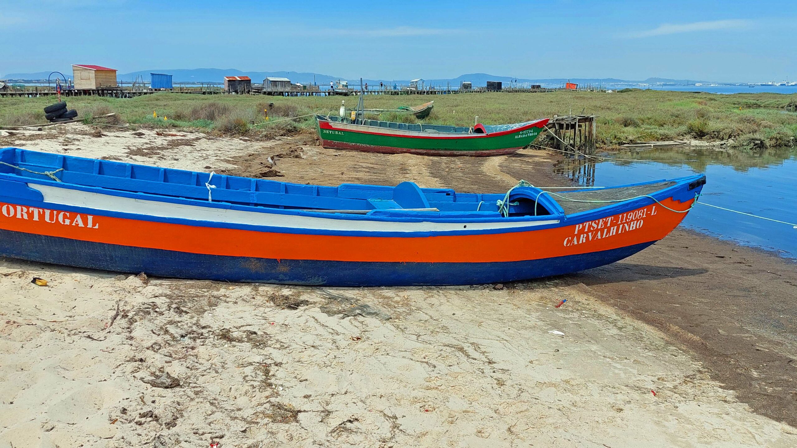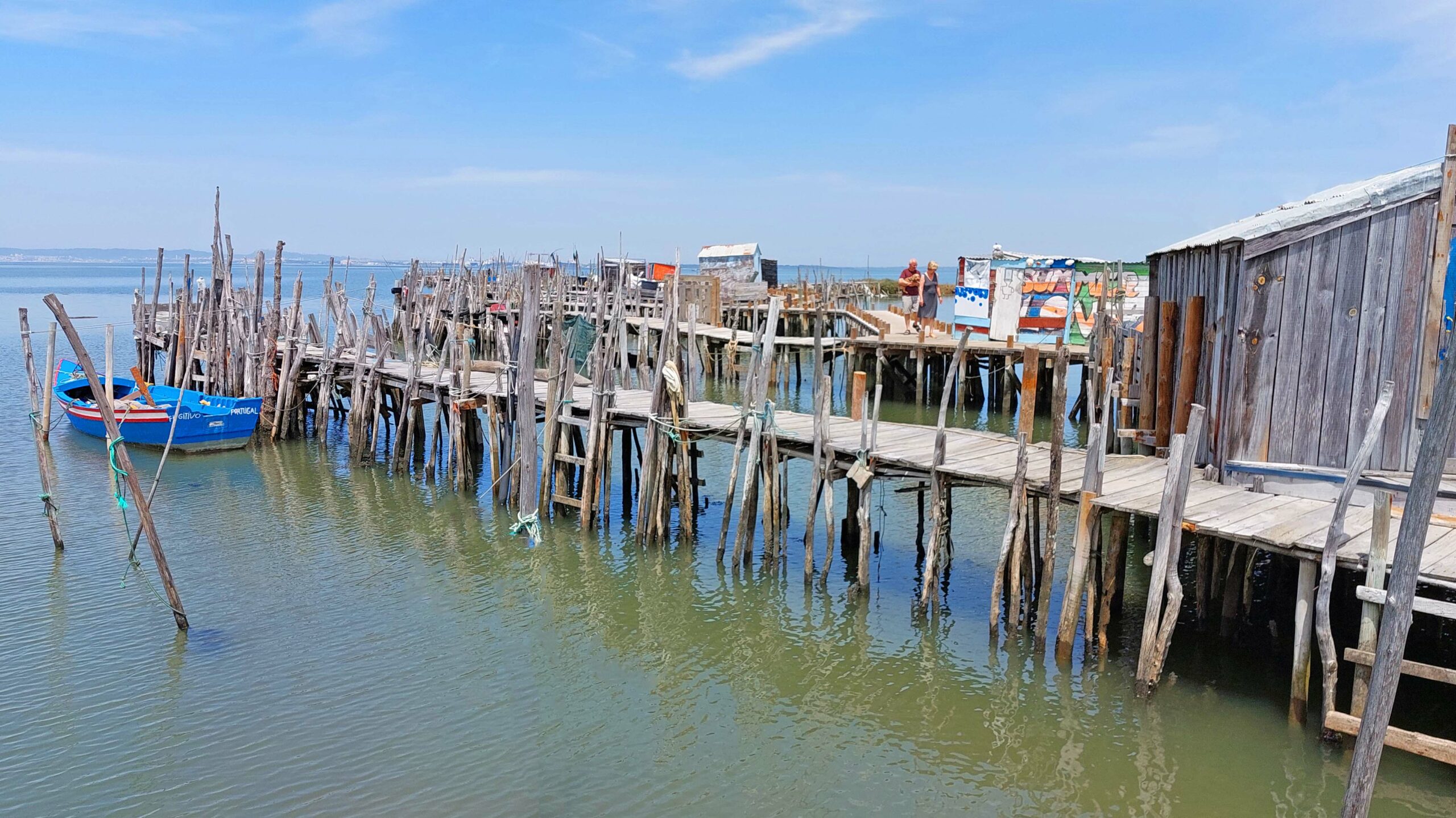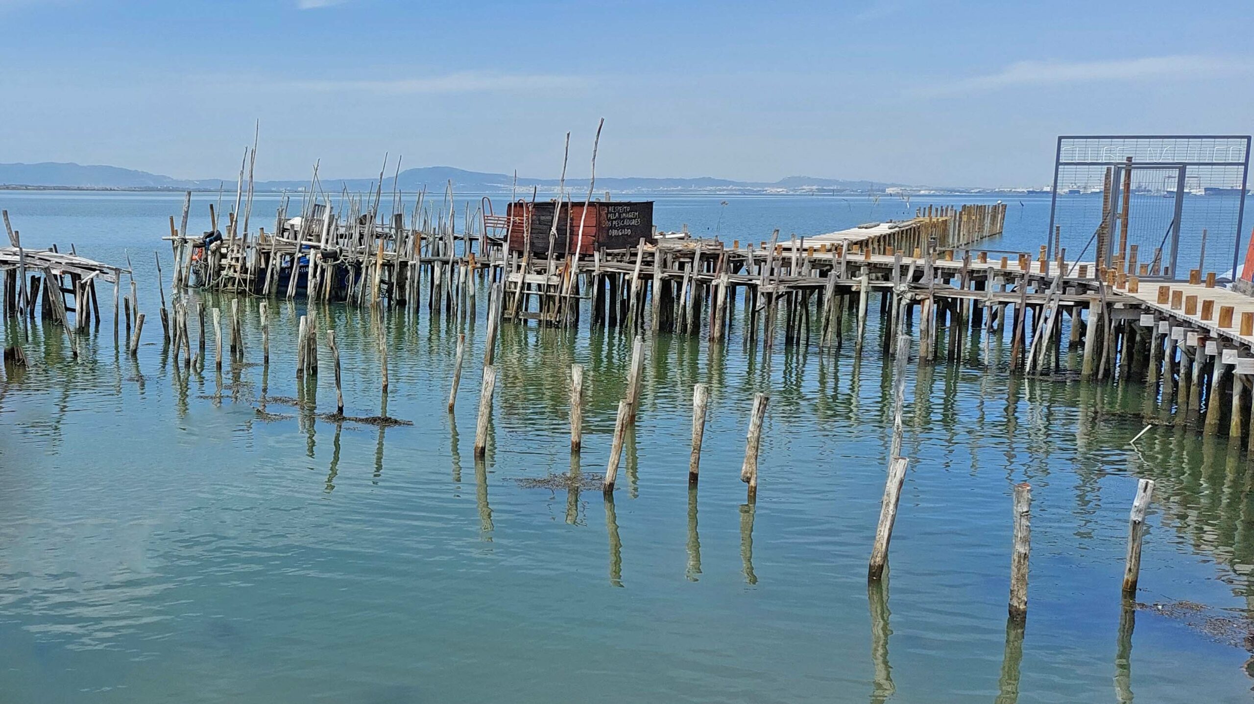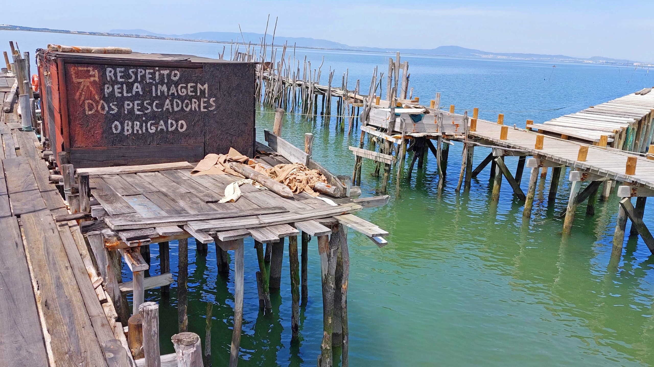 Relaxed fahre ich nach Carrasqueira, einem unscheinbaren Fischerdorf. Hier gibt es eine in Europa einzigartige Touristenattraktion im Porto de Pesce: winzige Fischerhütten auf ineinandergreifenden Stegen, die auf Holzstehlen im Wasser stehen. Diese Cais de Palafitas, sind von den Fischern in den 50er und 60er Jahren errichtet worden. Heute stehen sie unter Denkmalschutz und sind ein außergewöhnliches Fotomotiv. Die Holzstege sind gezeitenfest, auch wenn sie heruntergekommen aussehen und baufällig wirken. Ich begegne einem Fischer, der gerade seinen Fang in einer Schubkarre zum Auto bringt. Es ist eine einmalige Kulisse, fast wie in einer Filmscene.